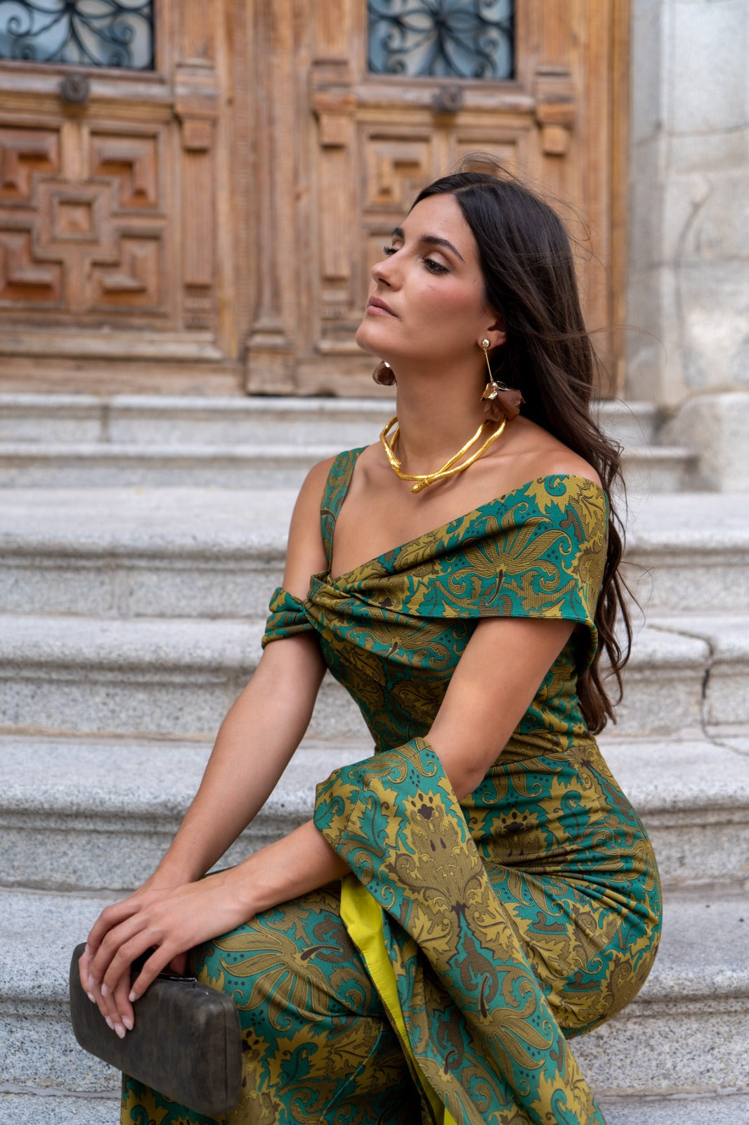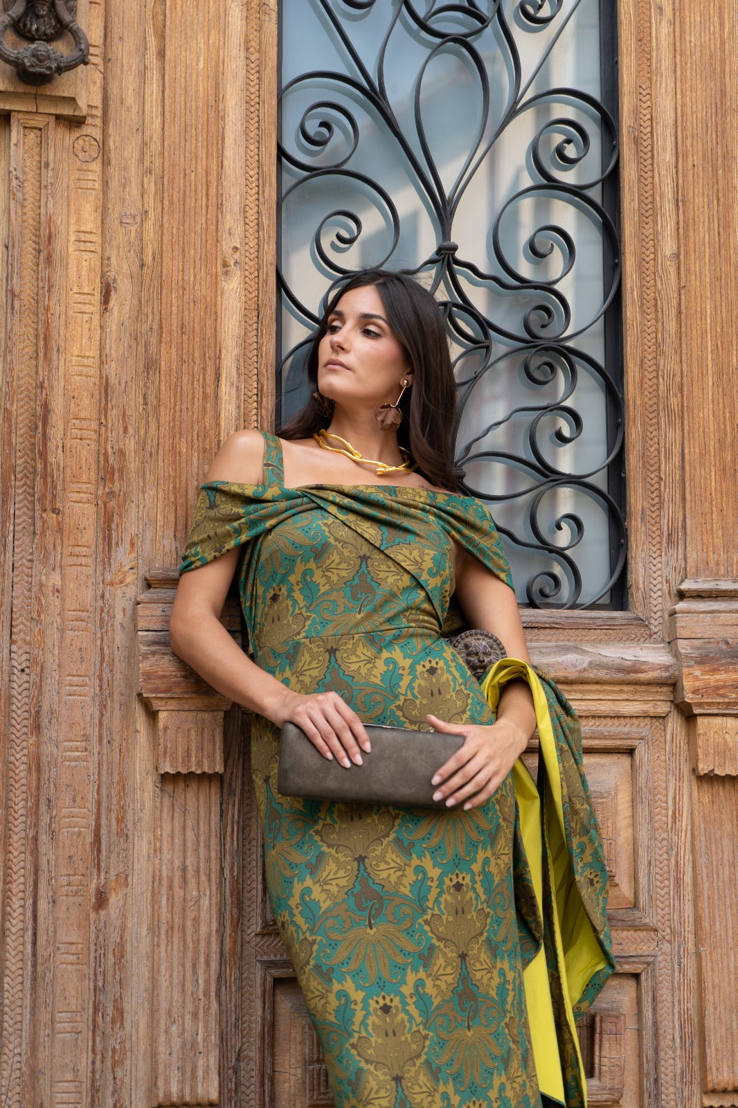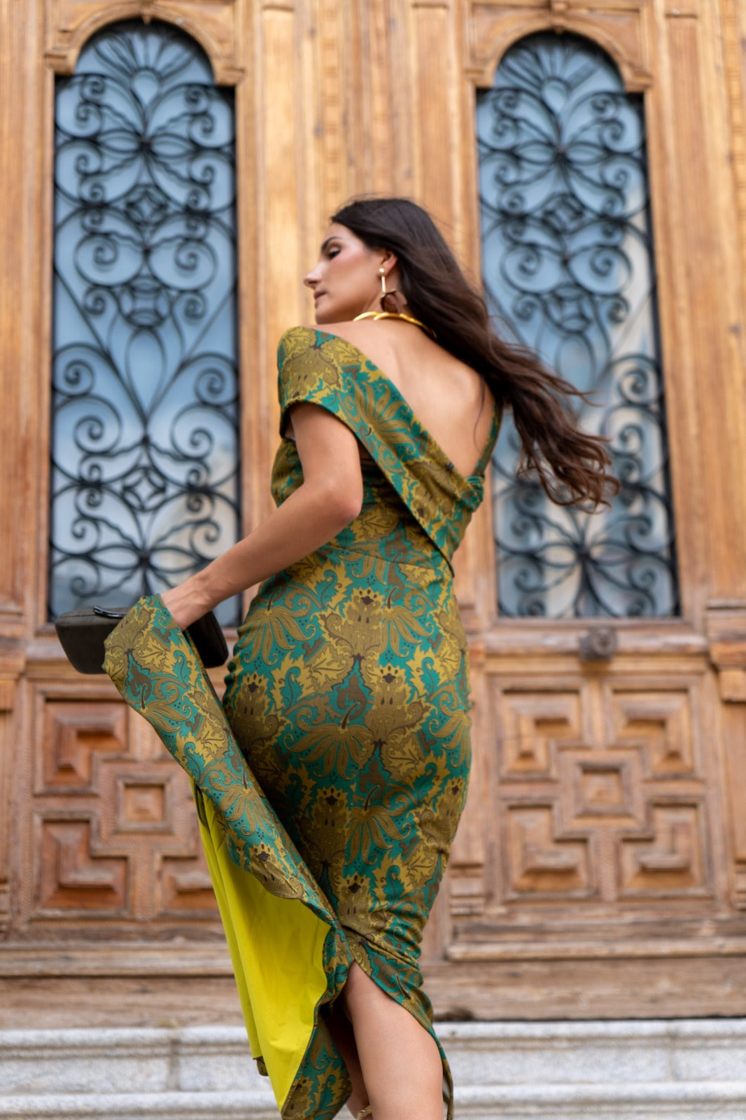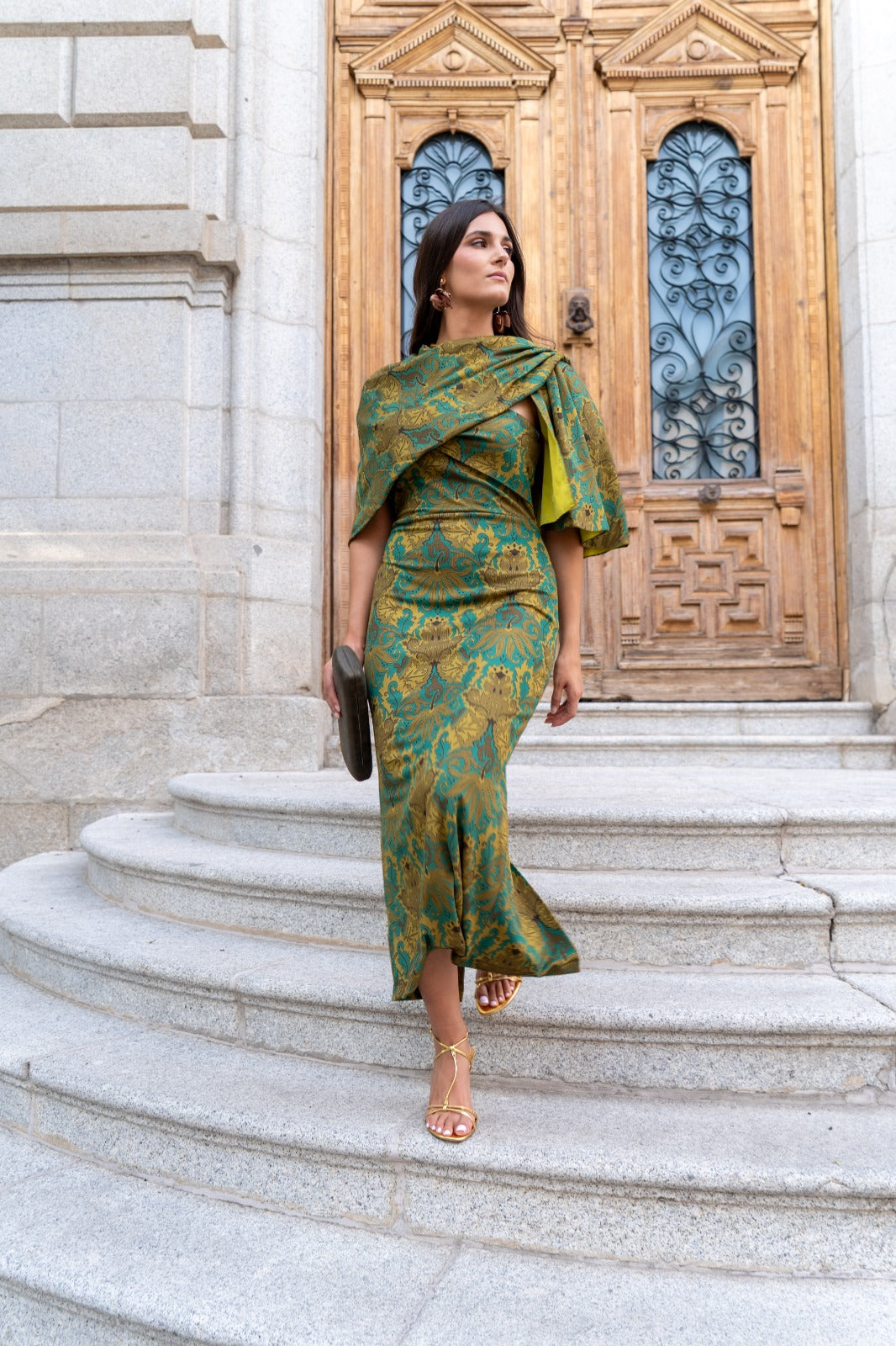 Vestido midi, escote abierto, recto, con capa que se quita y pone, abertura trasera, en jaquar estampado color verde.
