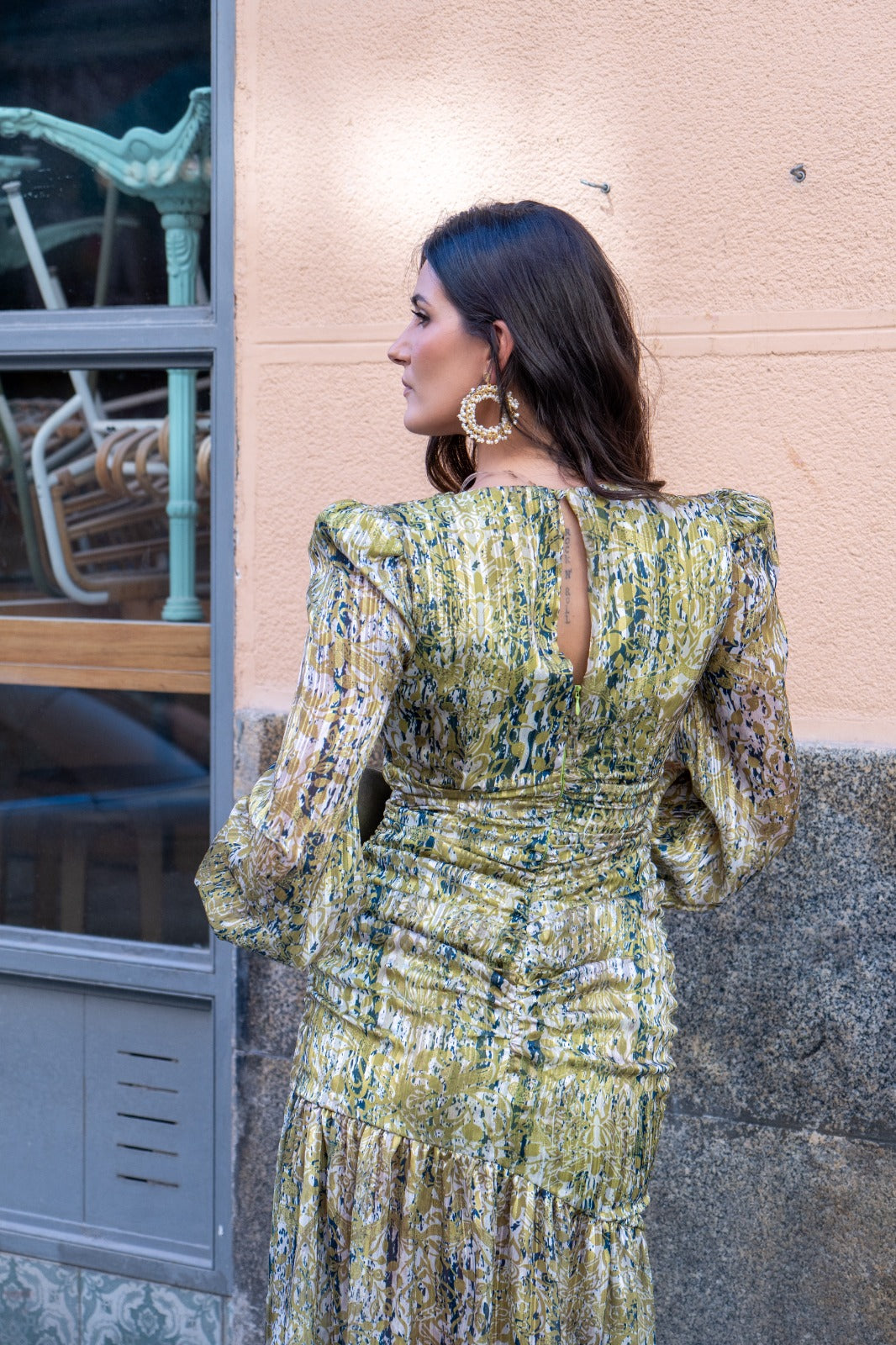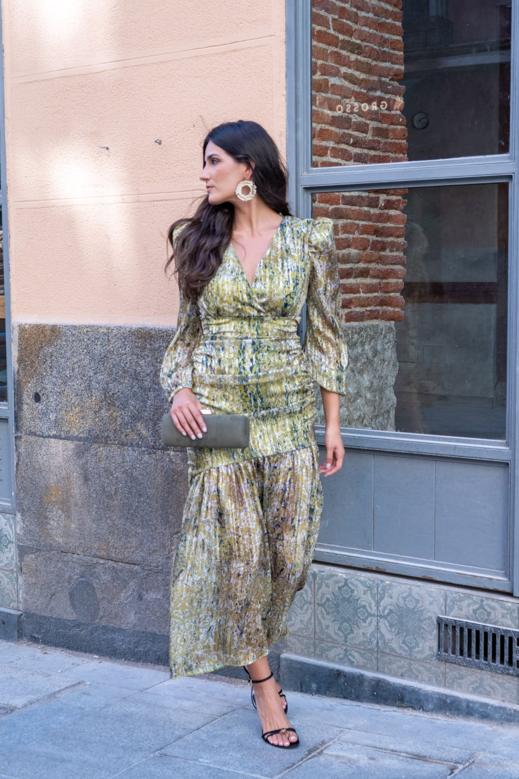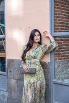 Vestido escote a pico cruzado, manga larga, fruncido en la parte delantera y trasera, volante abajo. En color verde estampado.
