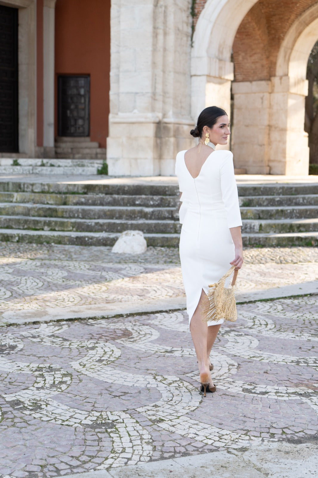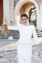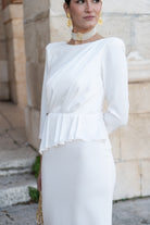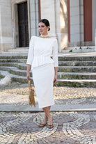 Vestido midi, escote delantero redondo y escote trasero a pico, manga francesa, peplum en cintura, abertura trasera. En color blanco.