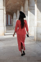 Vestido maxi midi, escote corazón, manga francesa, peplum en cintura, abotonado, abertura trasera. En color coral.