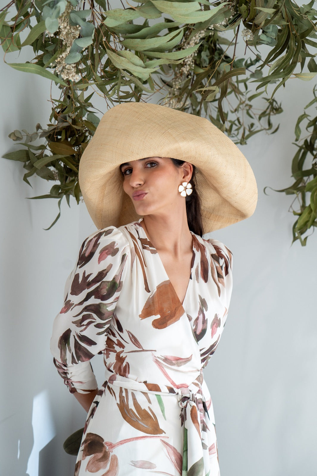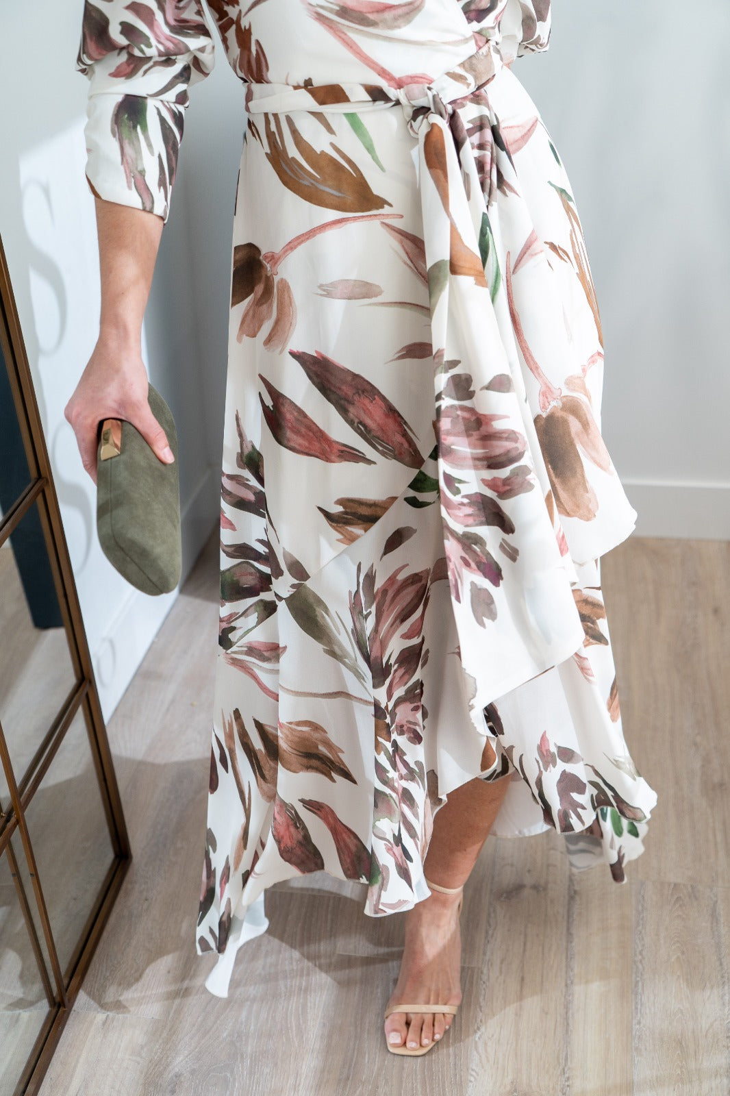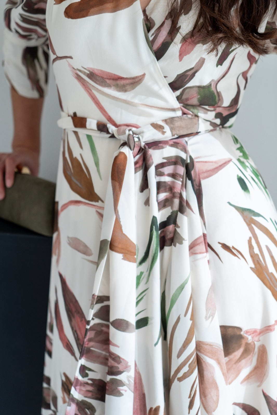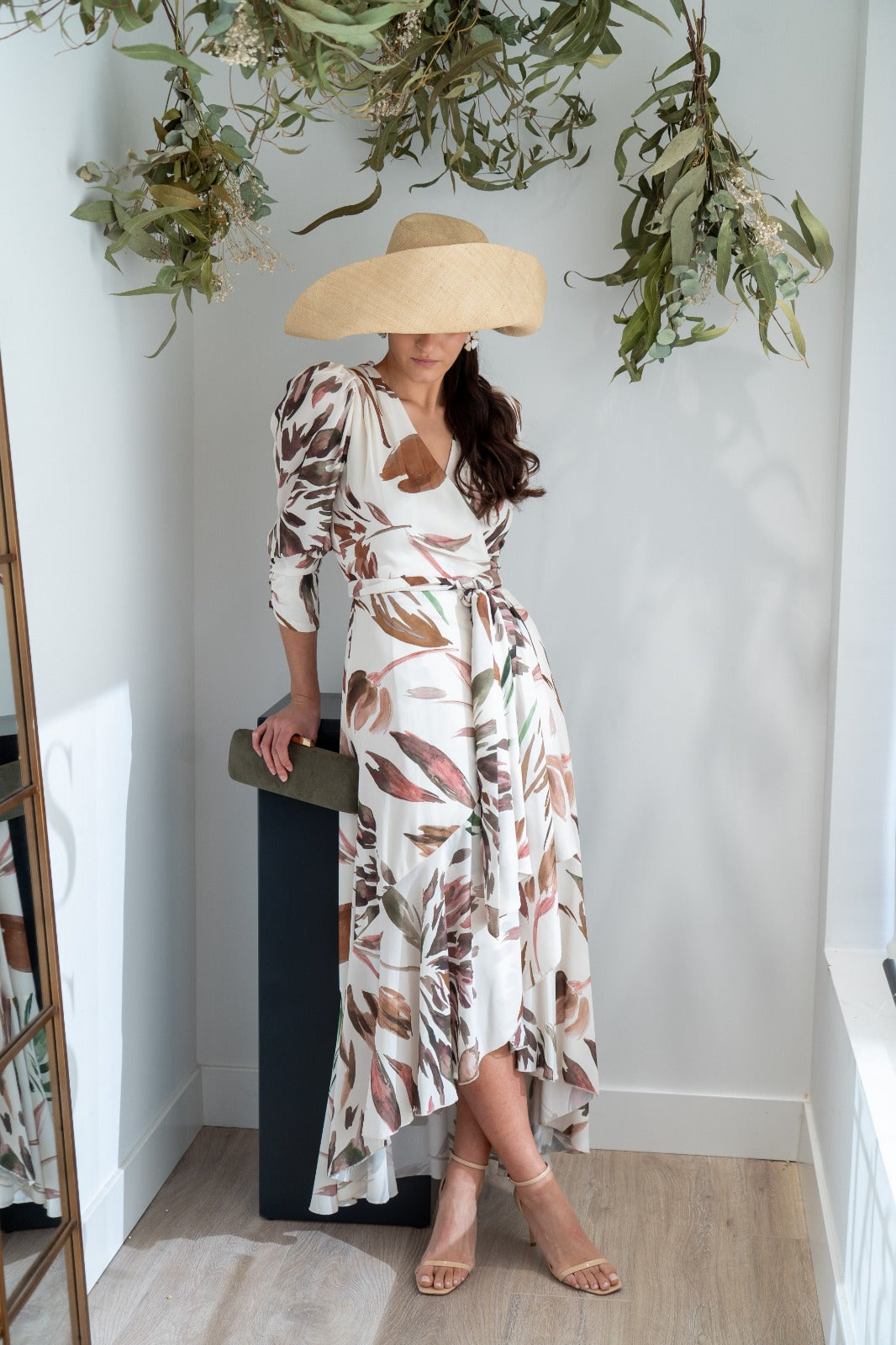 Vestido cruzado, manga corta fruncida, volante y forma en el bajo. En color blanco con estampado.