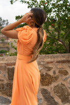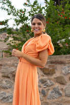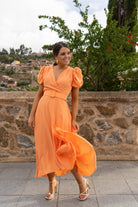 Vestido midi, escote cruzado, manga corta abullonada, falda con vuelo, cinturon incluido. En color coral.
