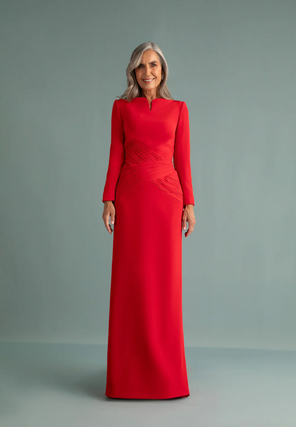 Vestido en triacetato con abertura en V en el escote y manga larga. Drapeado en georgette realizado a mano que cruza el delantero y espalda. En color rojo.
