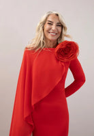 Vestido de crepé con escote barco y manga larga. Corte en la cintura con falda sirena. Capa de gasa asimétrica que cae en diagonal sobre el cuerpo delantero hasta el bajo de la espalda. Flor al tono realizada a mano sobre el hombro.