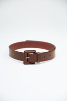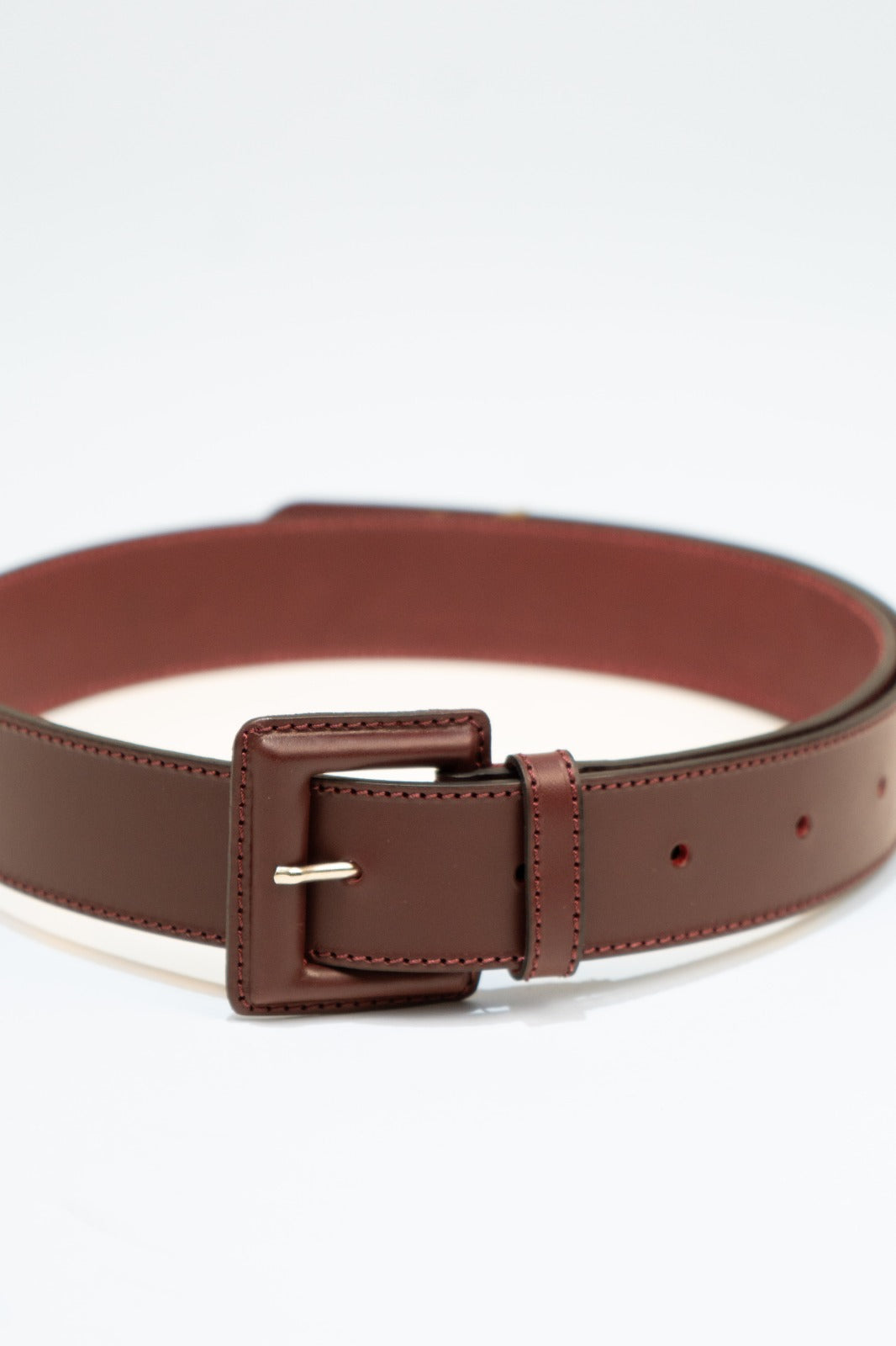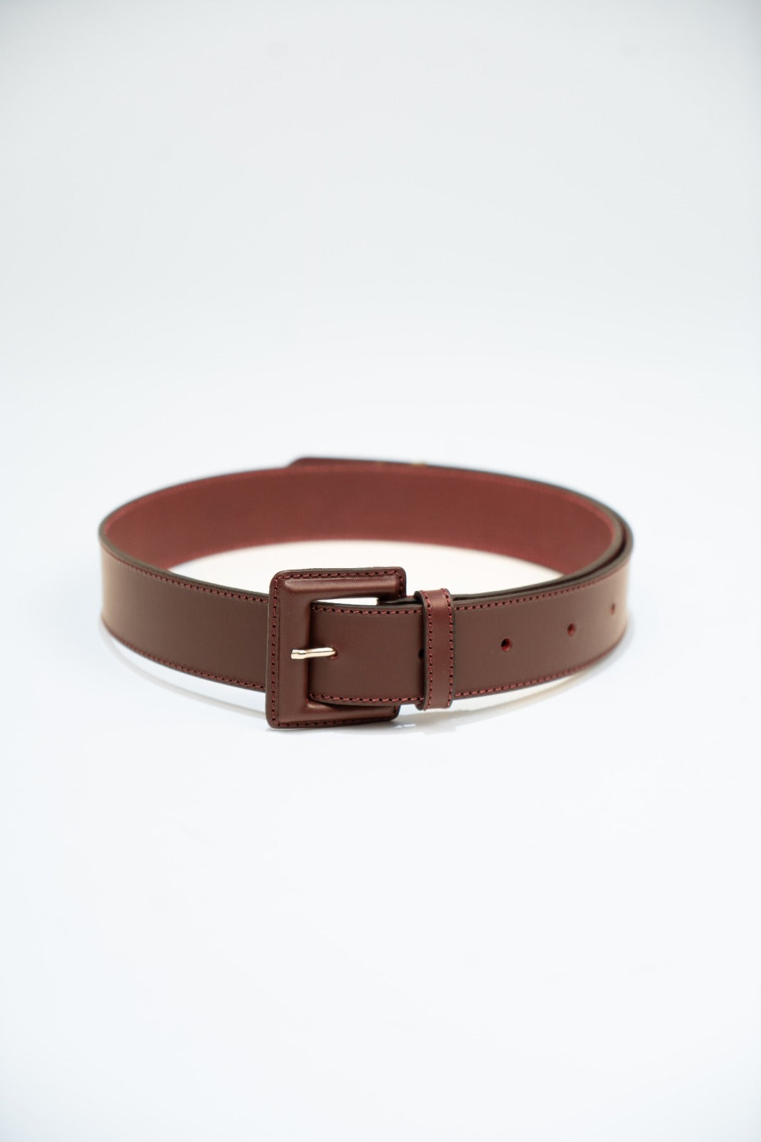 Cinturón confeccionado en piel color burdeos. Cierre delantero con hebilla forrada en piel.