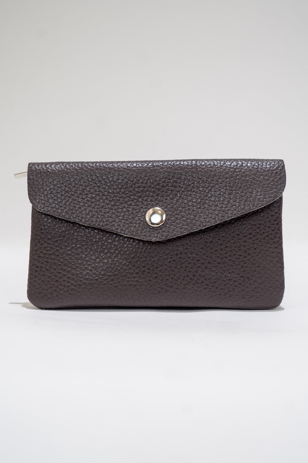 Cartera poli piel, cremallera y varios departamentos interior, cierre con automático, en color marrón.