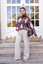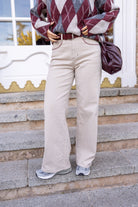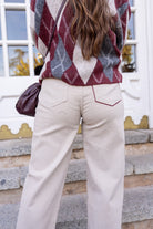 Pantalón vaquero tiro alto, bolsillos traseros y bolsillos delanteros, ancho, en color beige con detalle pespuntes burdeos. Cinturón incluido.