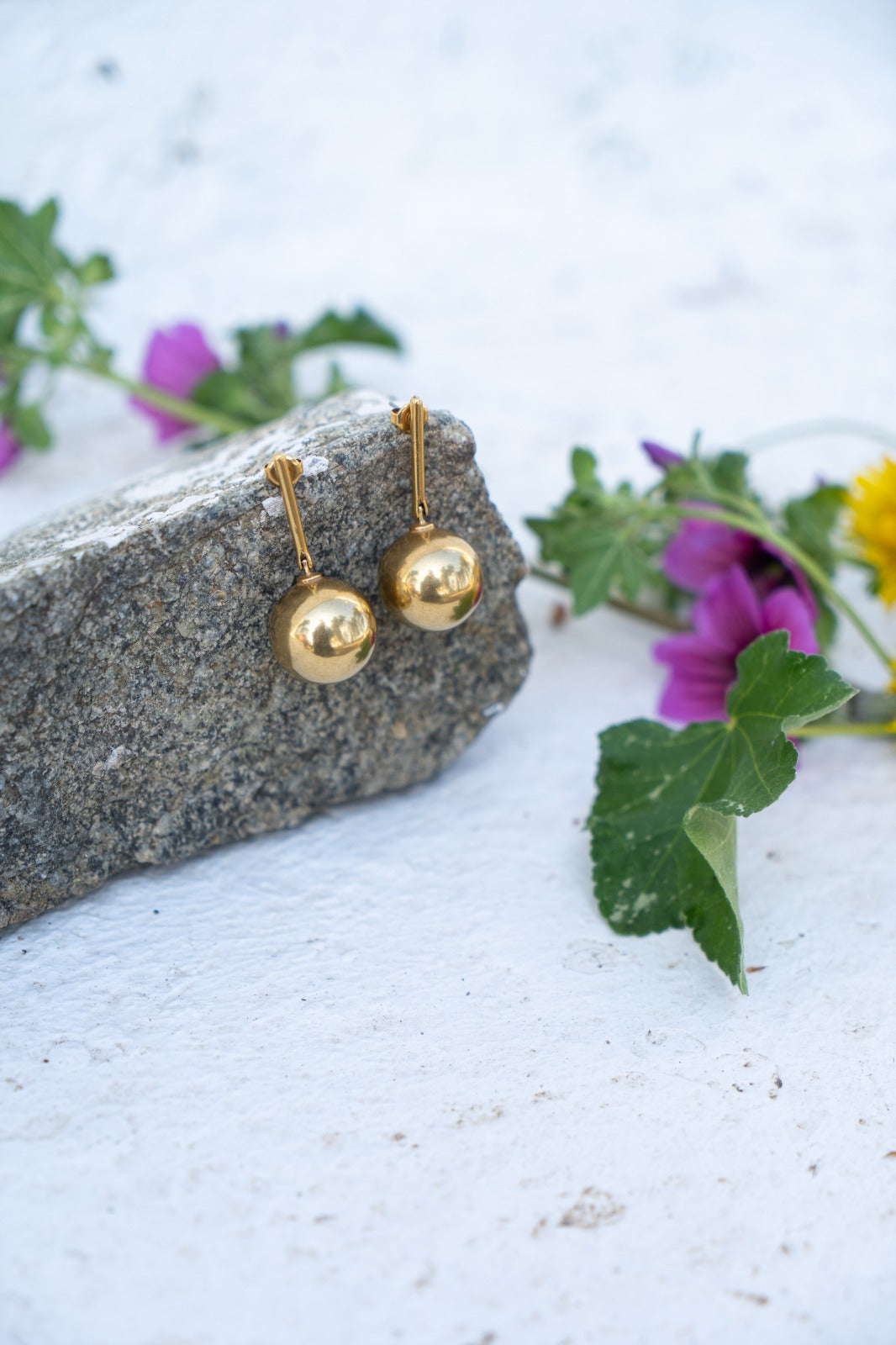 Pendientes elgantes, con esfera dorada que culega de una barra dorada, estructura geometrica y dorada.
