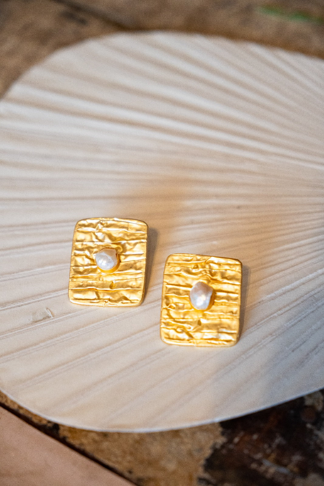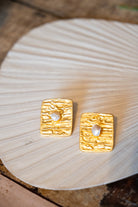 Pendientes cuadrados destacan por su relieve y una piedra en su centro. La perla varían al de la foto debido a su naturaleza.Composicion