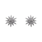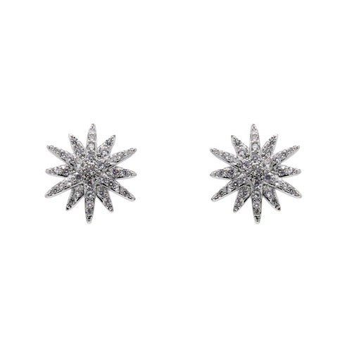 Pendientes en forma de estrella de base plateada, decorados con pequeñas circonitas. Algunas circonitas son más oscuras que otras. Cierre con tuerca.