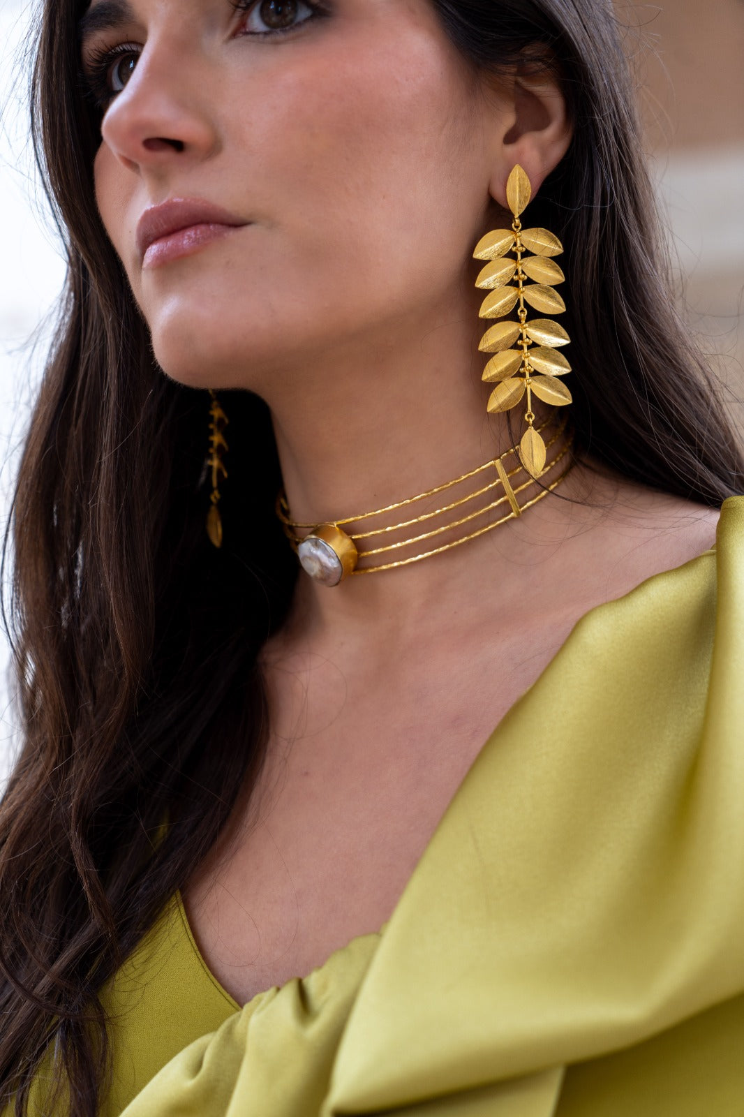 Pendientes largos formados por múltiples hojas artesanales, cierre con tuerca, dorados.