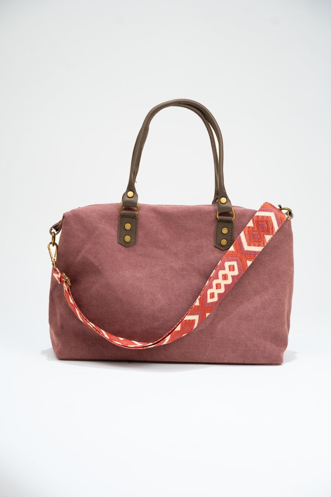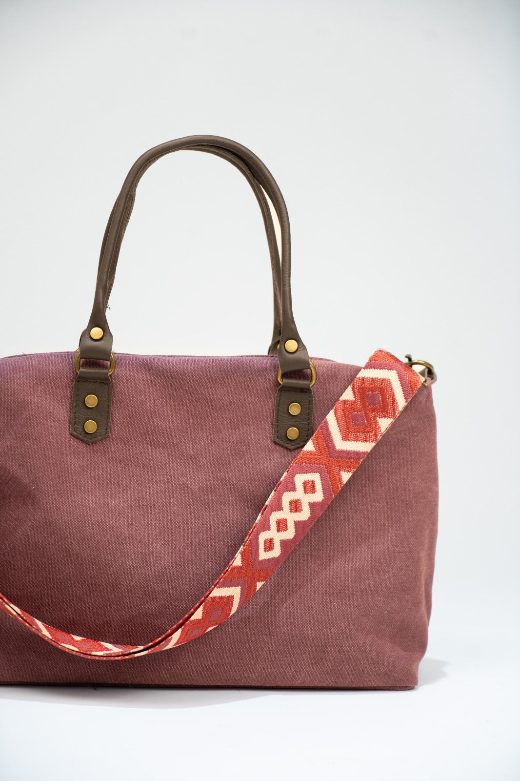 Bolso en loneta, con asas fijas en piel  y correa extraíble y ajustable de algodón en color marrón chocolate. Cierre con cremallera, forro interior en negro y bolsillo interior. En color burdeos.