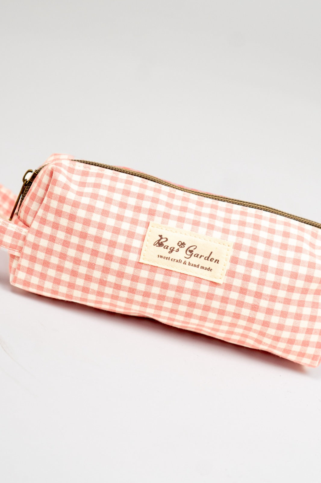 Estuche o neceser pequeño, cierre con cremallera, asa a un lado. En vichy blanco y rosa.