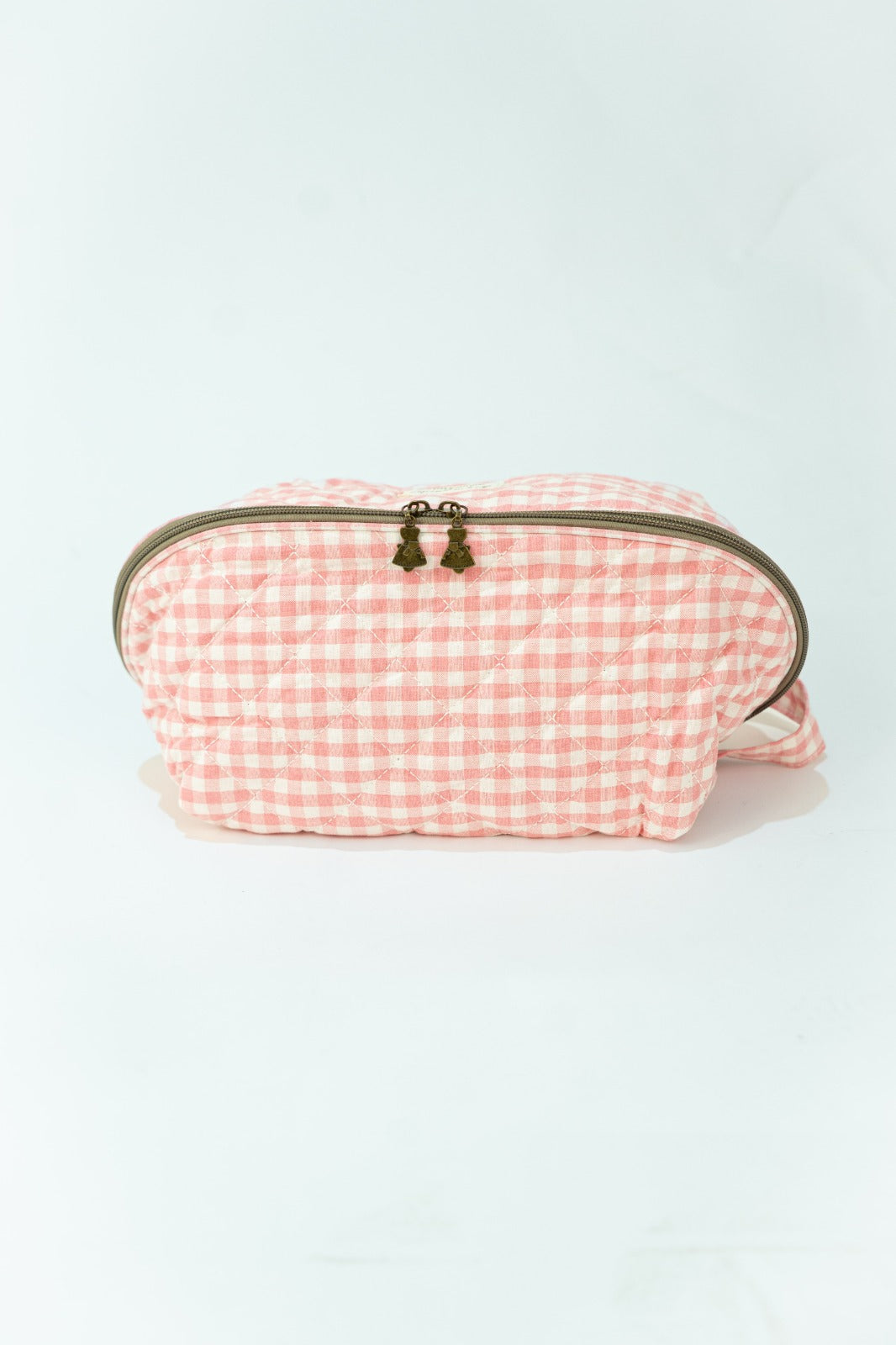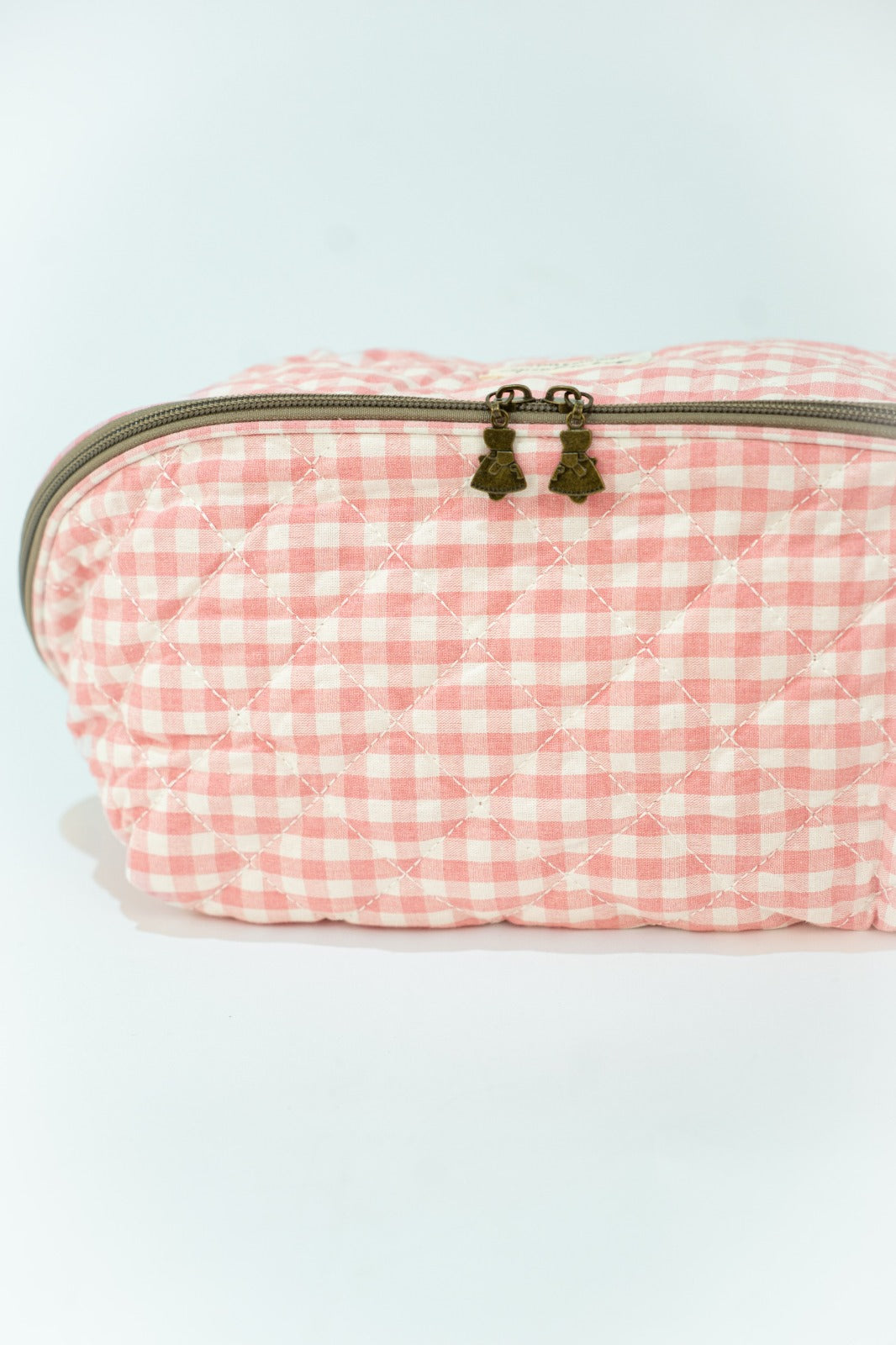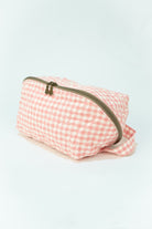 Neceser cierre con cremallera, asa en un lado, bolsillos interiores, en vichy blanco y rosa.