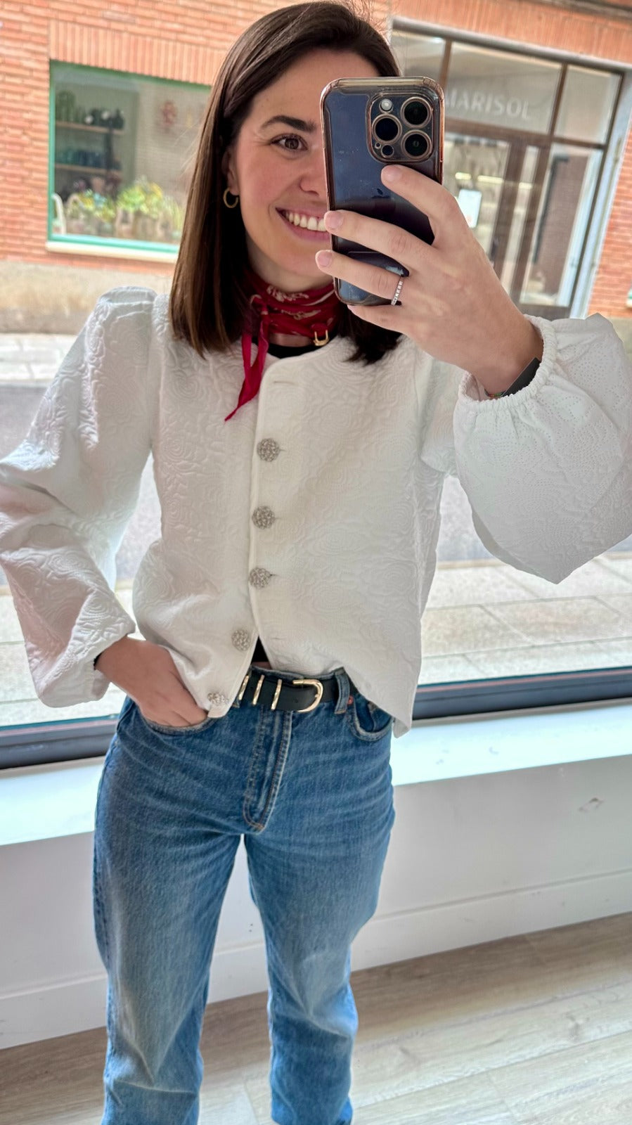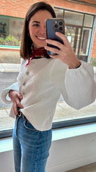 Chaqueta cuello redondo, manga larga abullonada con elastico en puño. En color blanco con dibujo.