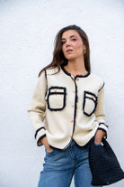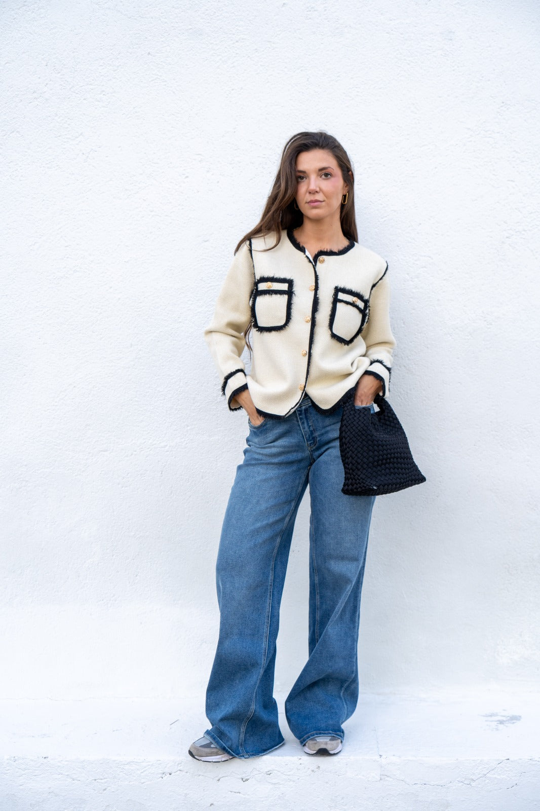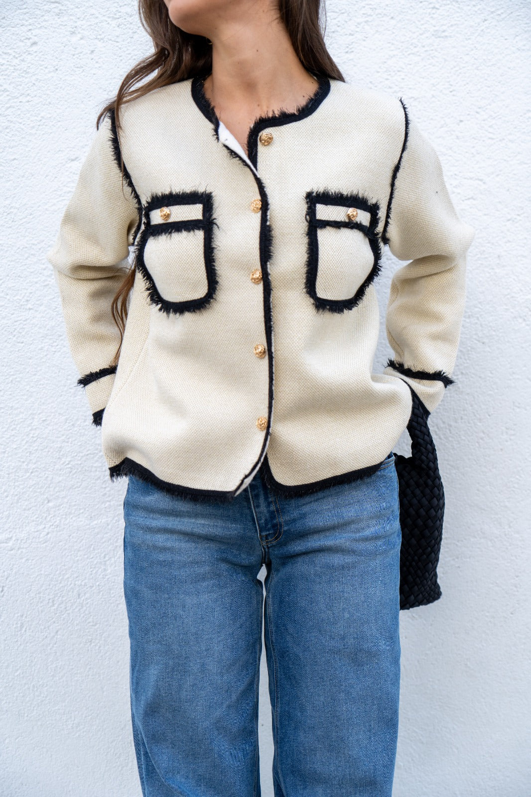 Chaqueta corta, escote redondo, manga larga, abotonada, bolsillos delanteros. En color beige con detalles negros y lurex dorado.