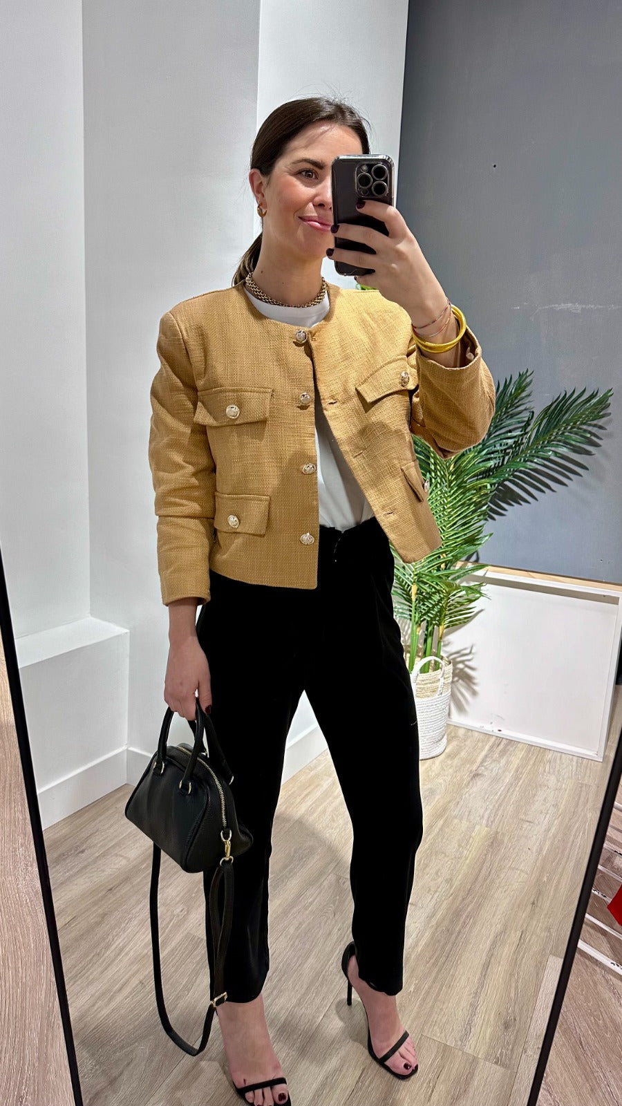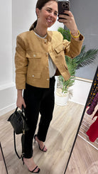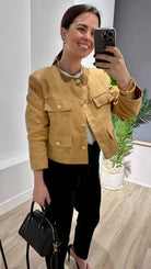 Chaqueta corta, escote redondo, manga larga, tapetas imitacion bolsillo con boton, abotonada. En color camel.