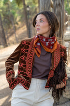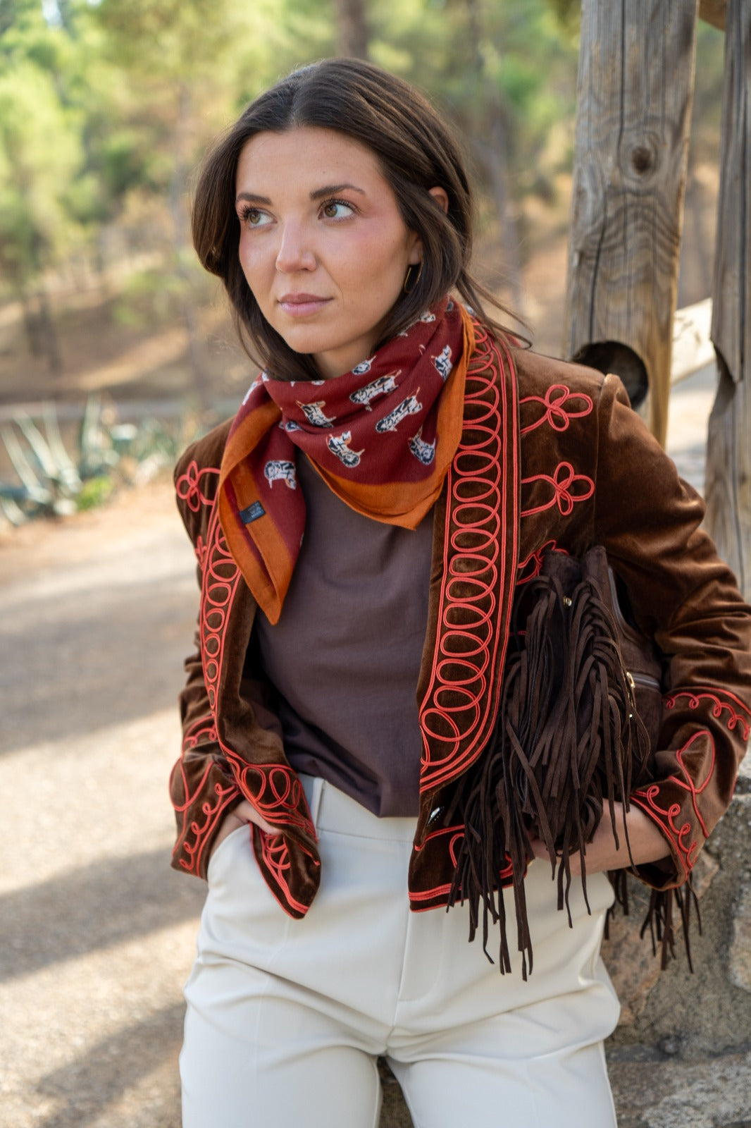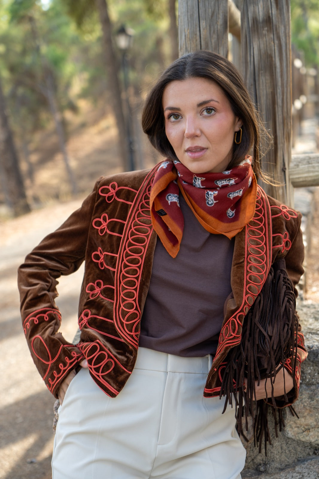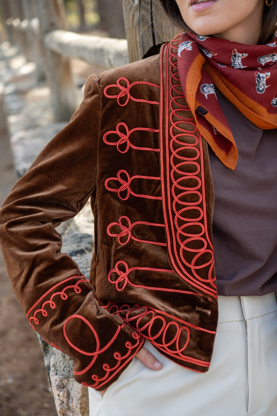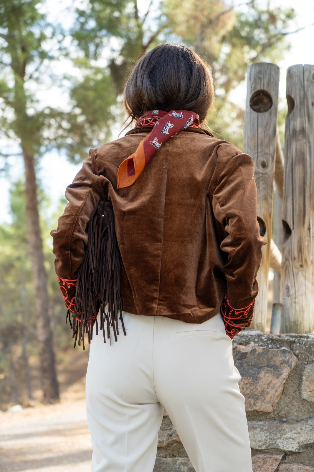 Chaqueta corta, cuello smoking, manga larga, cierre con botón en l aparte de abajo, en ante marrón con bordados naranjas.
