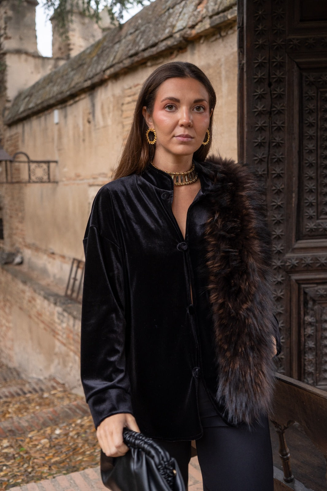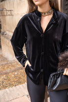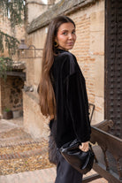 Chaqueta cuello mao, manga larga con puño, abotonada, en terciopelo negro.