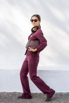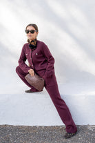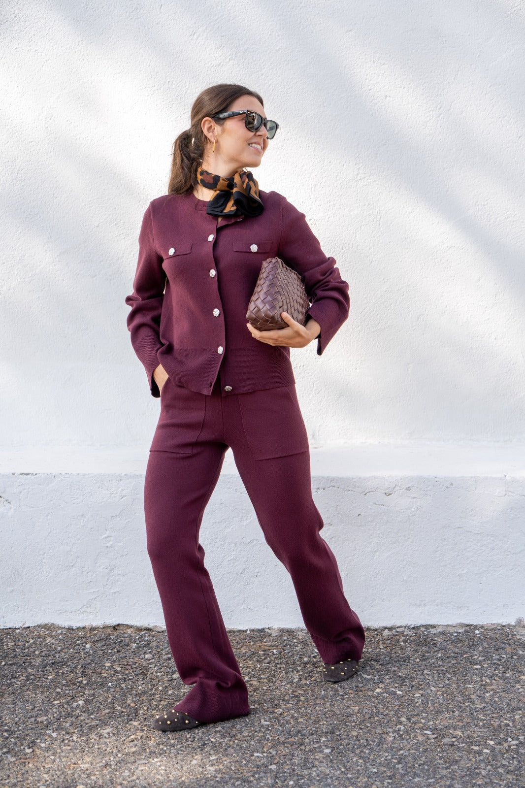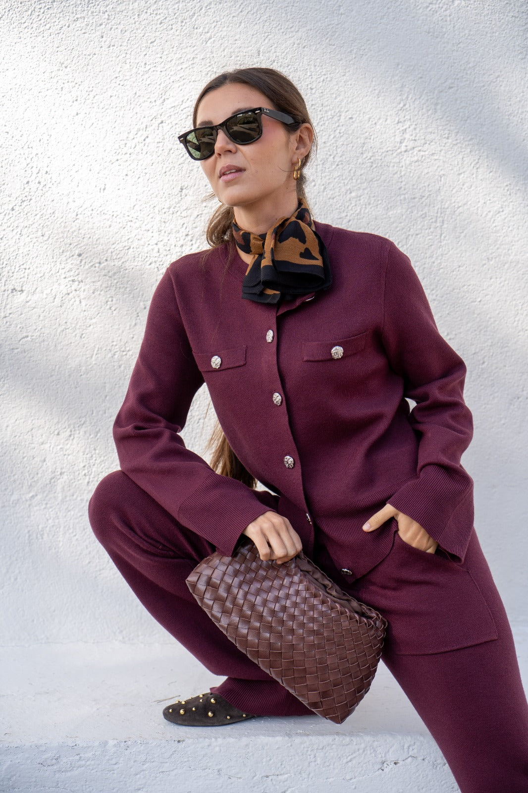 Conjunto punto, compuesto por chaqueta abotonada, y pantalón con goma y bolsillos laterales. En color burdeos.