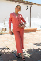 Conjunto compuesto por chaqueta manga larga, cruzada y pantalon alto, cintua, bolsillos laterales. En color coral.