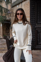 Conjunto punto, compuesto por jersey cuello redondo , manga larga con puño y pantalón con goma. En color beige con cenfa negra.