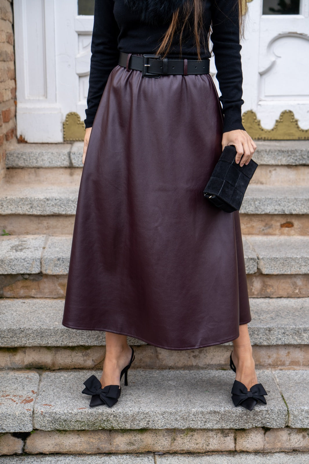 Falda en poli piel, cintura engomada, corte evase, en color burdeos.