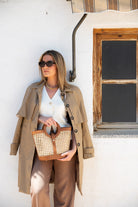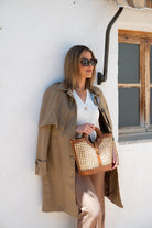 Gabardina abotonada, bolsillos laterales, forrada en tela de cuadros, abertura trasera. En color marron.