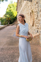 Vestido midi, sin mangas, cuello redondo con cruce en pecho, corte en cintura, falda evase. En color celeste con estampado.