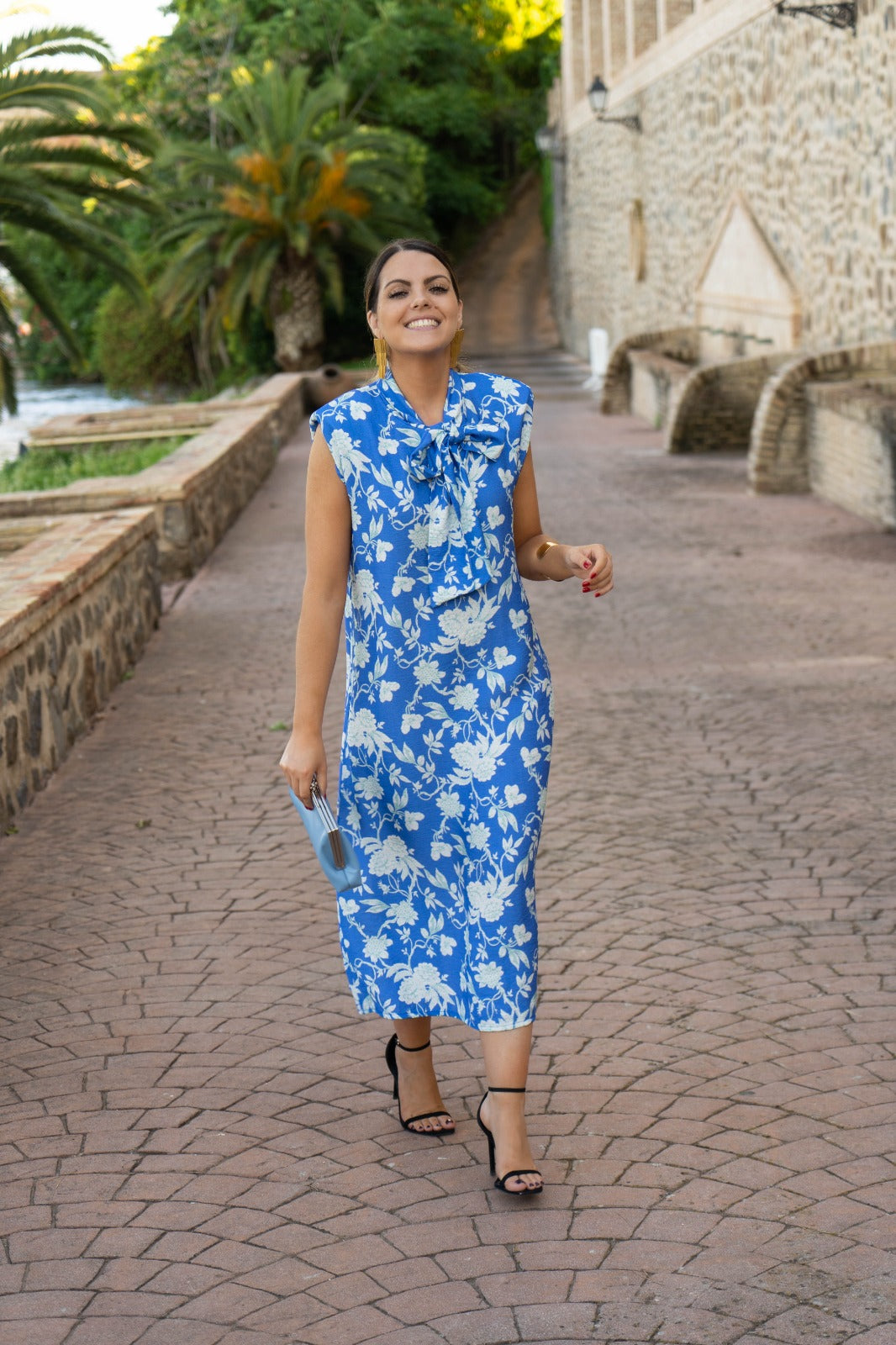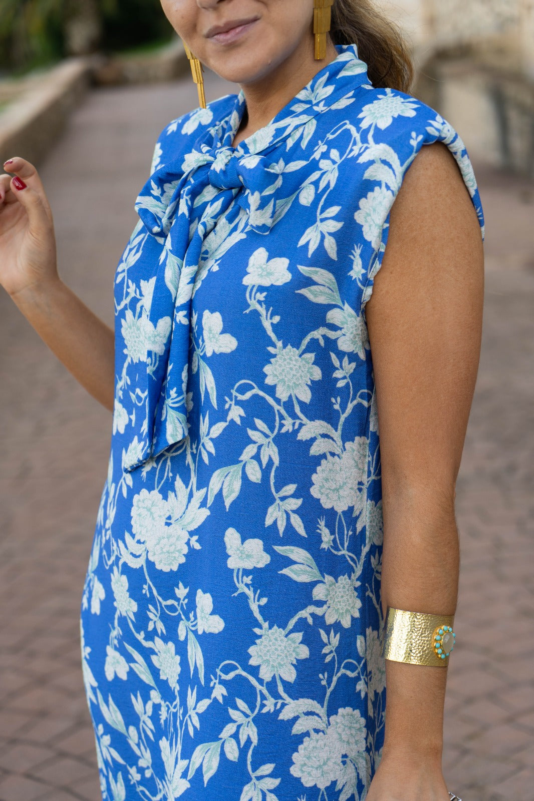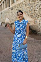 Vestido midi, sin mangas, hombrera alta, escote a pico con lazo para anudar. En color azul con estampado blanco.