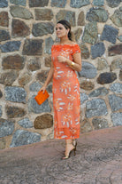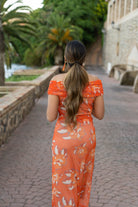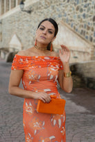 Vestido midi, hombros descubiertos, manga corta, totalmente elastico. En color naranja con estampado.