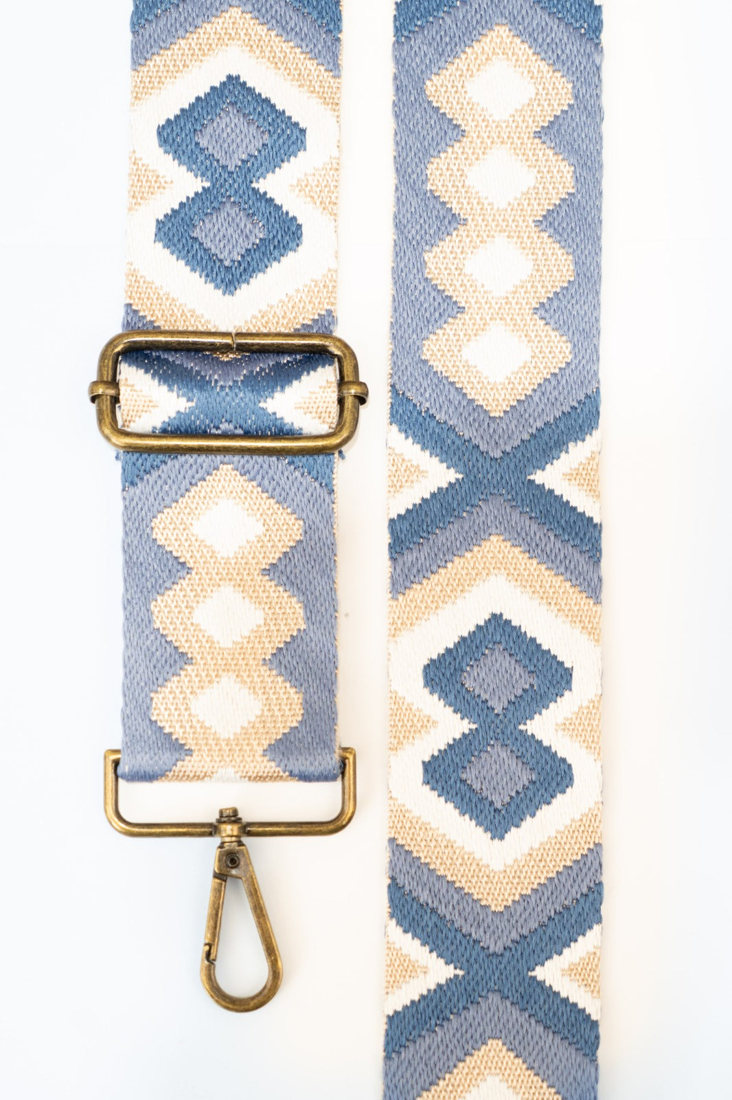 Asa bandolera étnica tejida con diferentes estampados en azul y beige. Combinable con los bolsos Cies y Cotal.