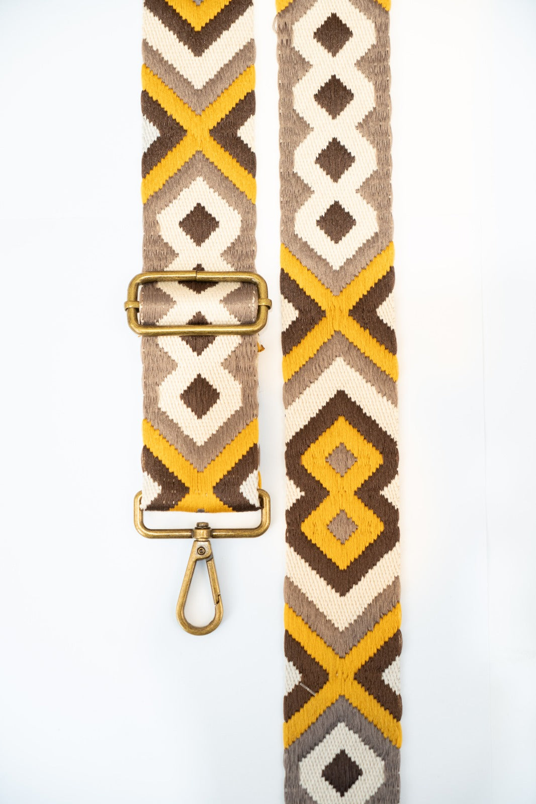 Asa bandolera étnica tejida con diferentes estampados en mostaza y marrón. Combinable con los bolsos Cies y Cotal.