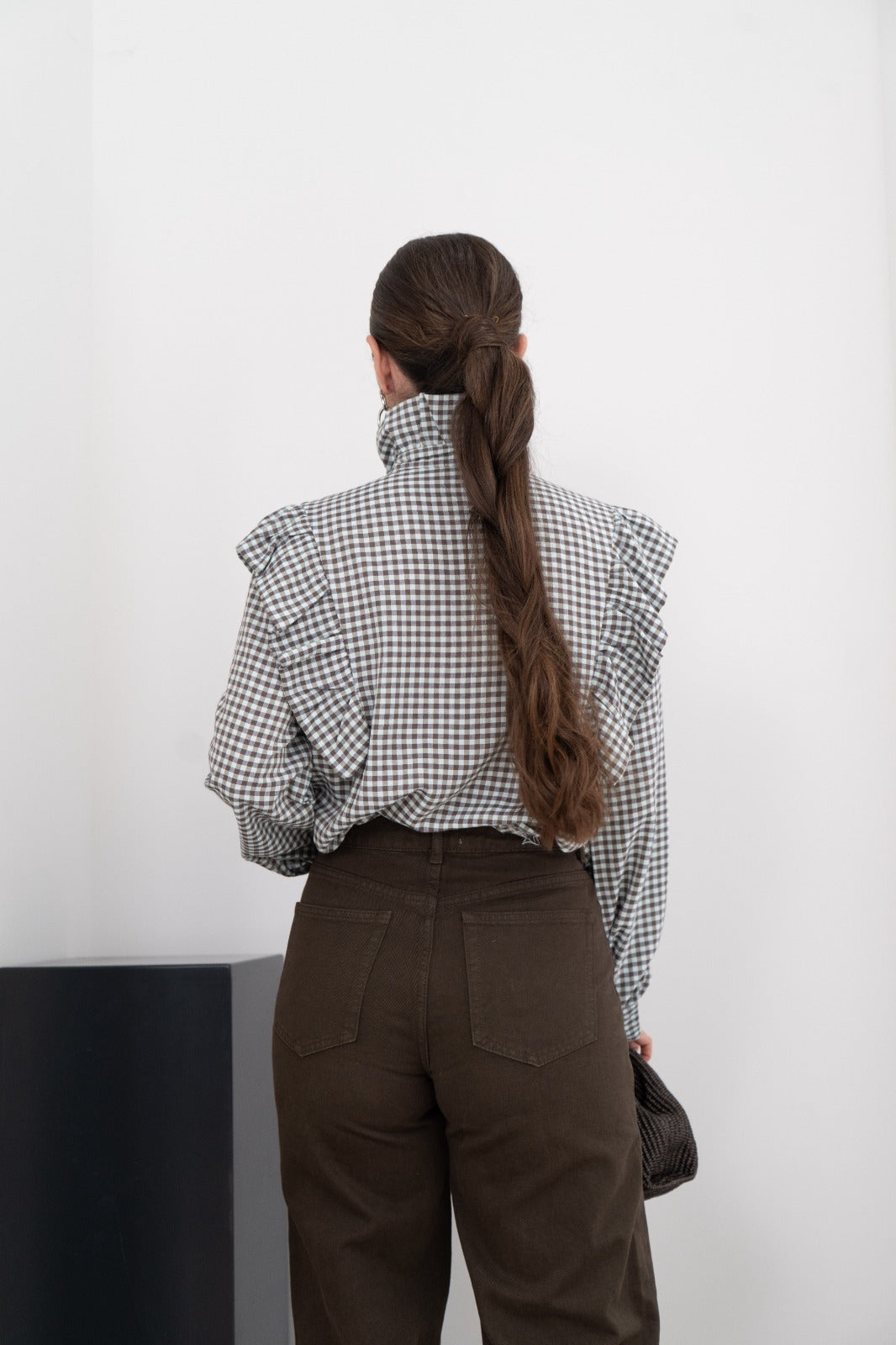 Blusa cuello subido abotonada, manga larga con puño, volante en hombros. En vichy marrón.