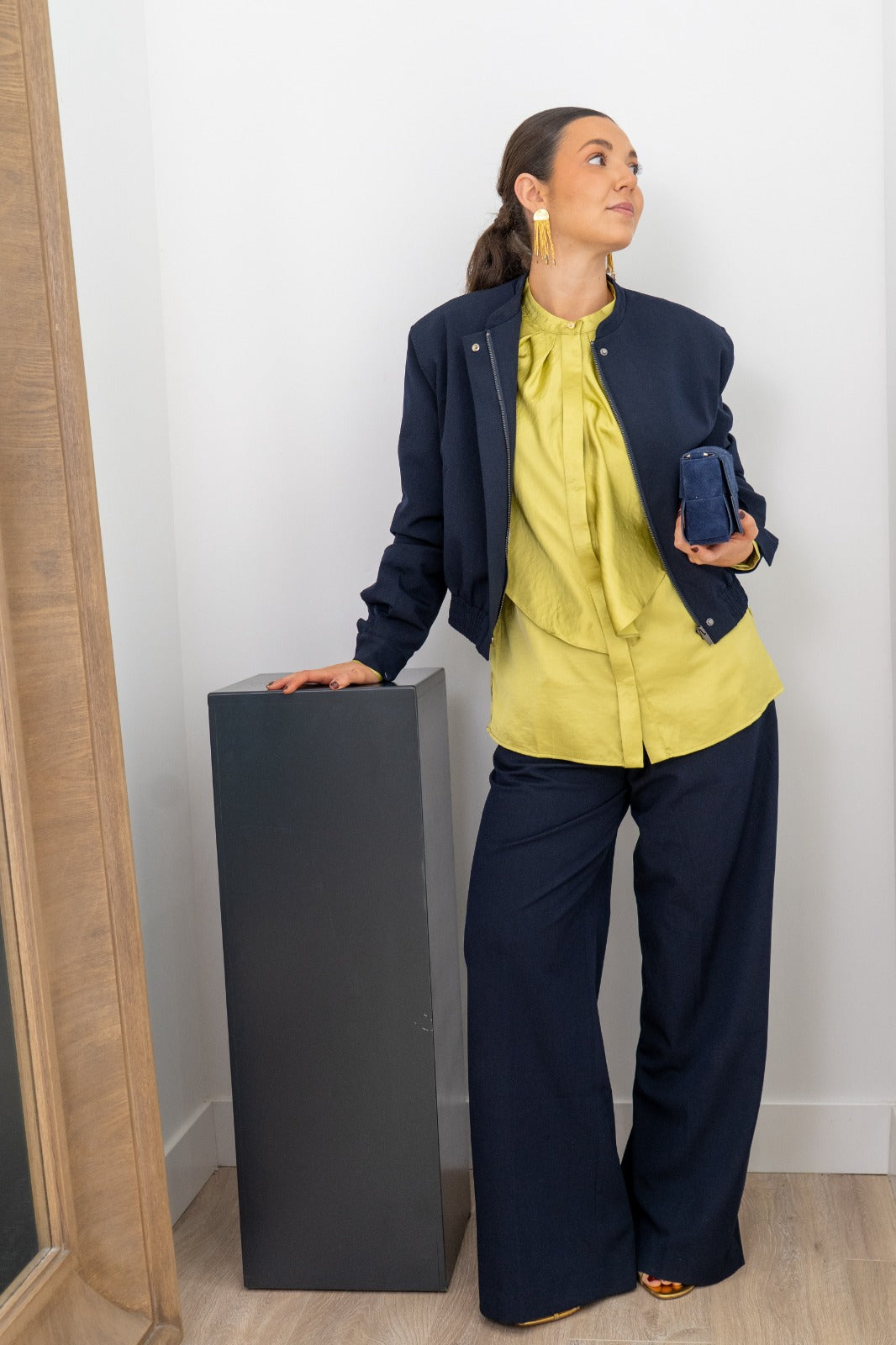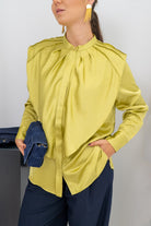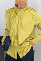 Blusa cuello mao, manga larga con puño, abotonada, detalle plisado en hombros. En saten color oliva.