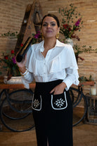 Blusa manga larga con puño, abotonada, volante en la parte delantera y mangas. En color blanco.