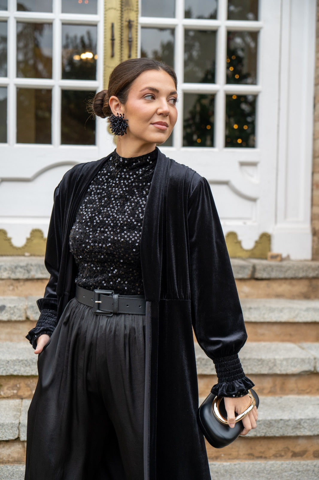 Body cuelo halter, manga larga, en color negro con lentejuelas.