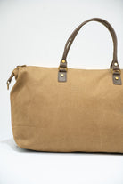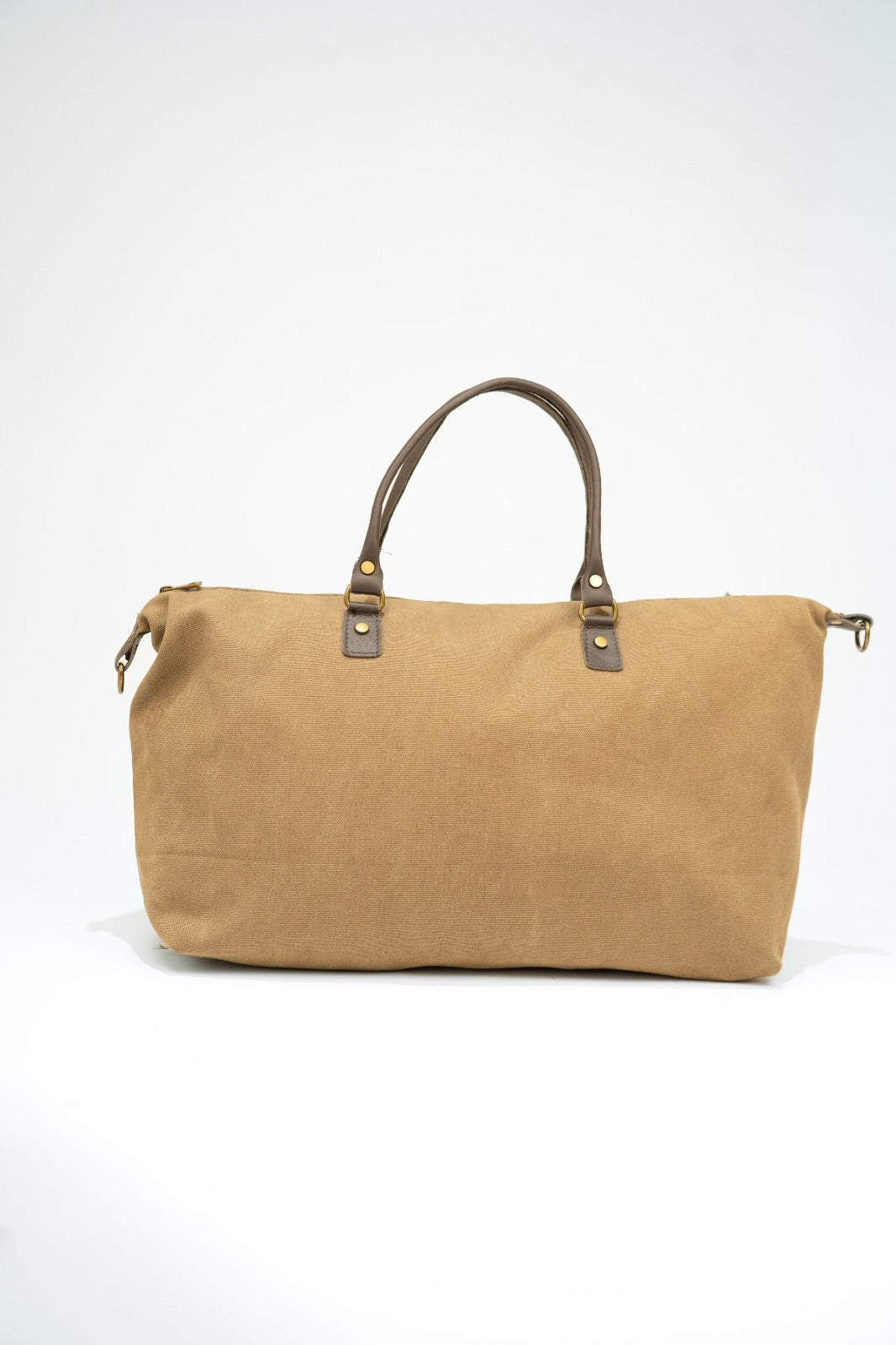 Bolso, maleta en loneta, con asas fijas en piel y correa extraíble y ajustable de algodón en color marrón chocolate. Cierre con cremallera, forro interior en negro y bolsillo interior. En color marrón.
