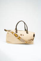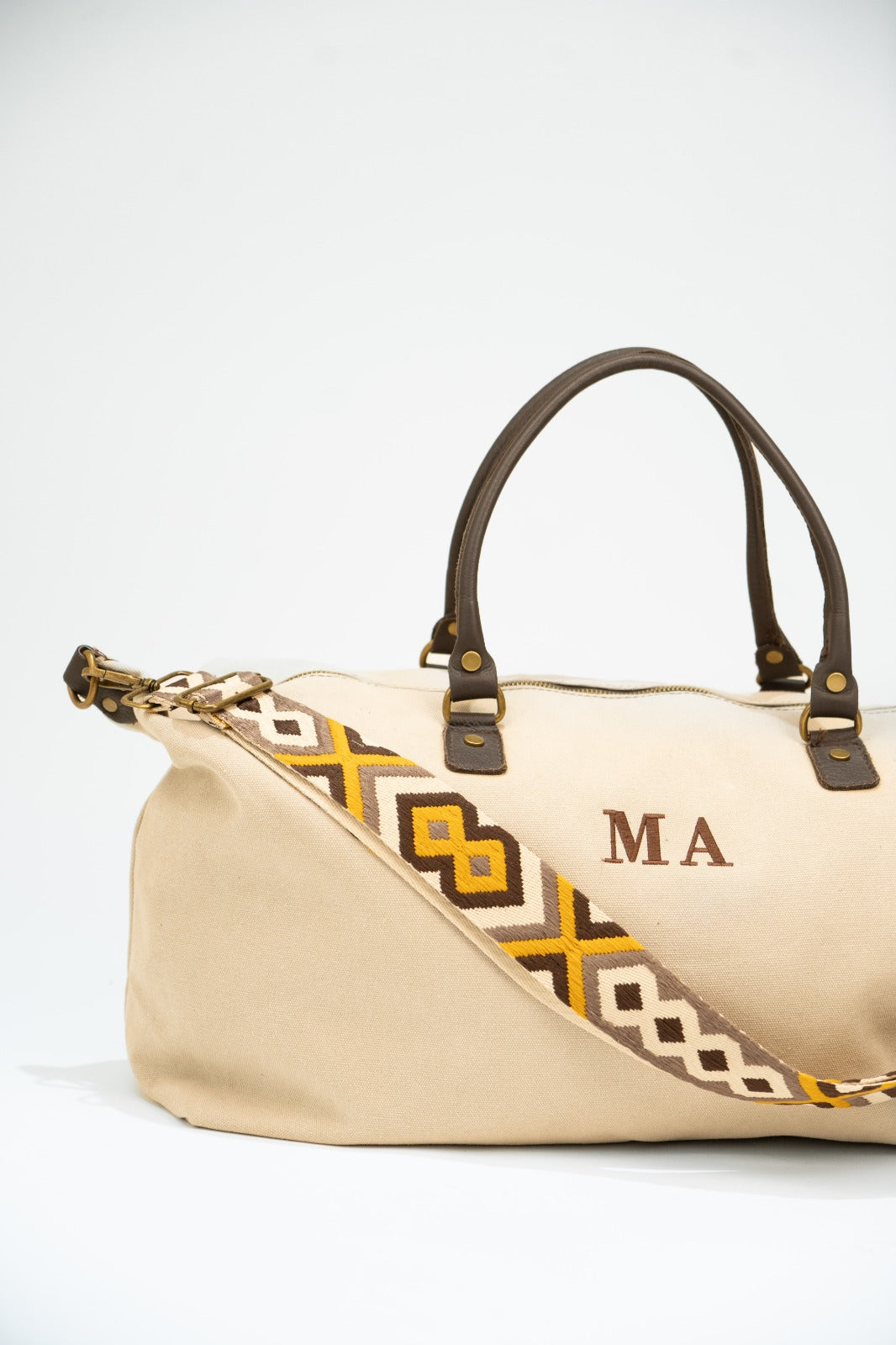 Bolso, maleta en loneta, con asas fijas en piel y correa extraíble y ajustable de algodón en color marrón chocolate. Cierre con cremallera, forro interior en negro y bolsillo interior. En color beige.