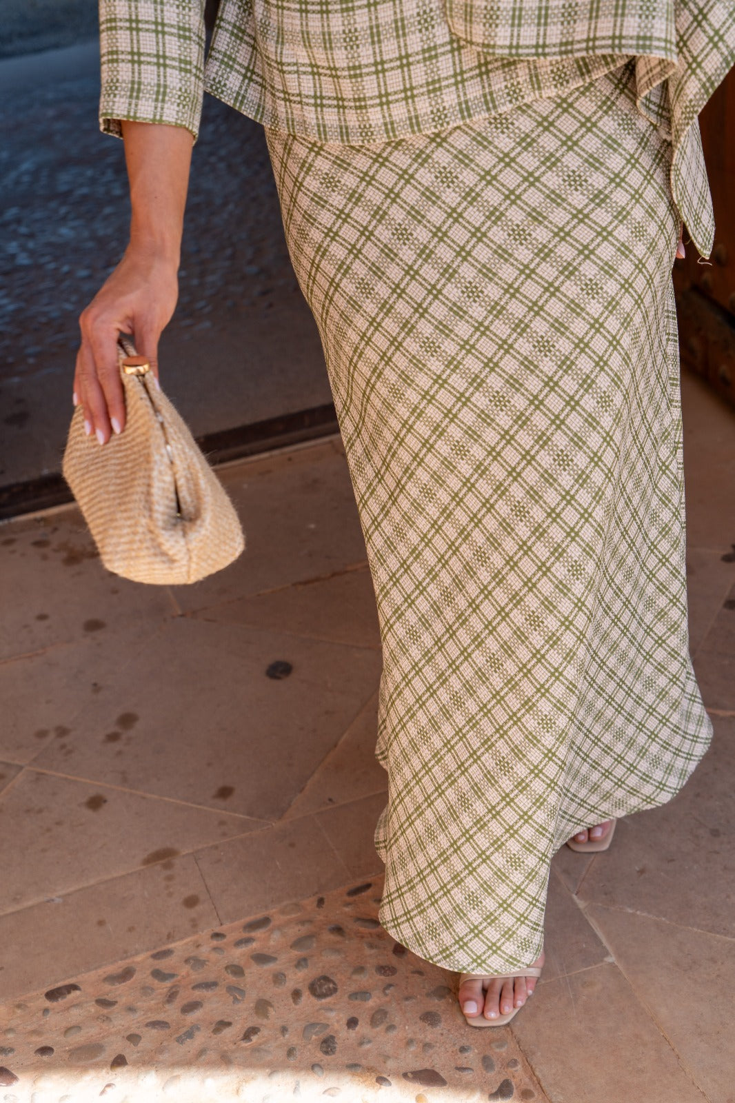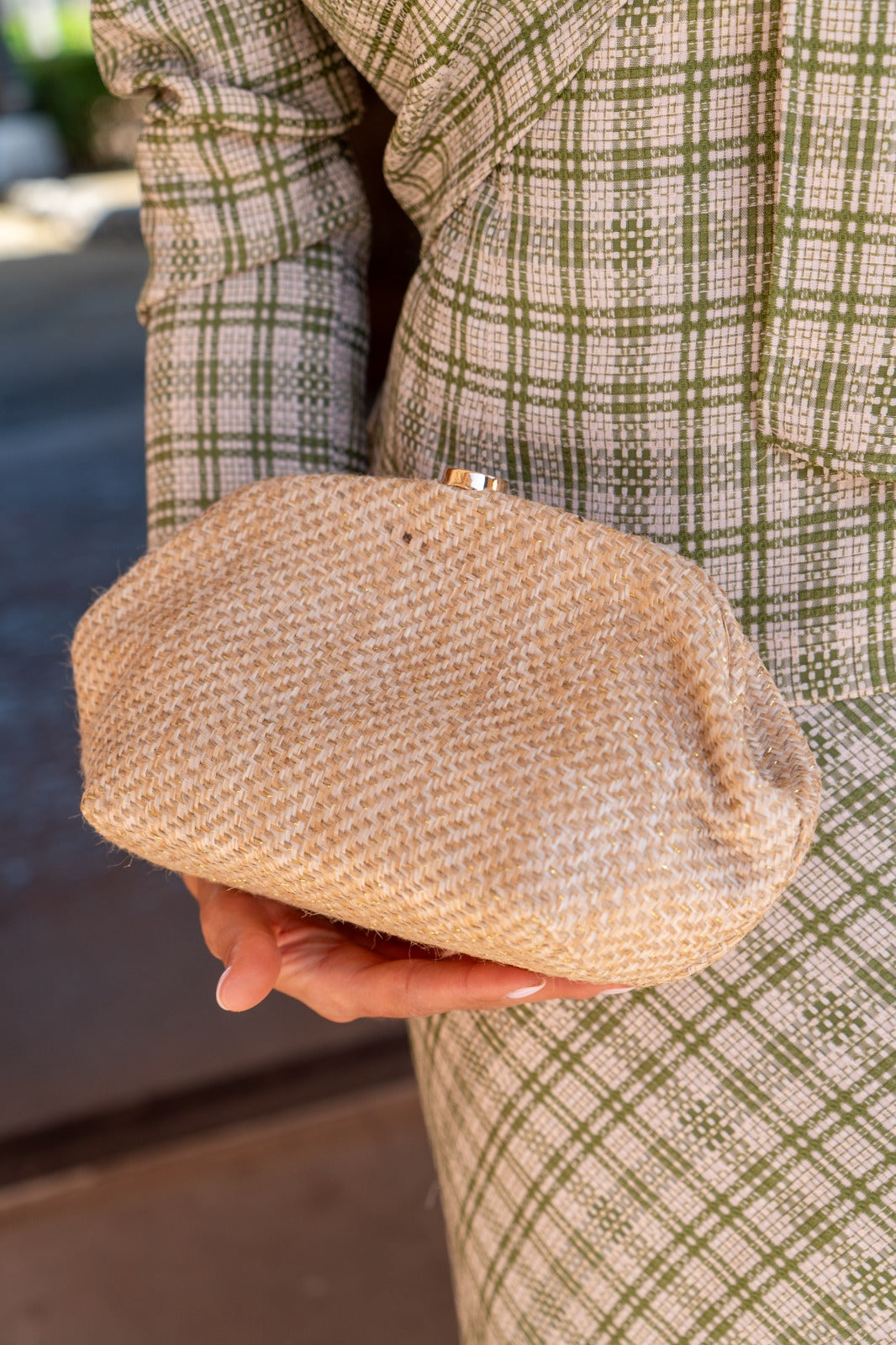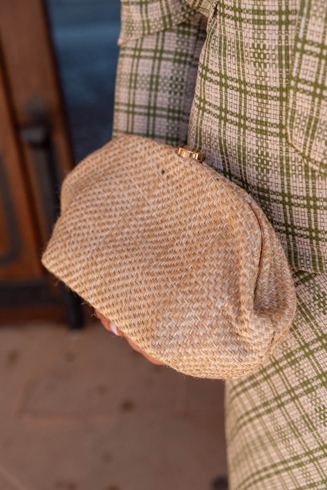 Bolso en tejido tipo ratán, cierre con imán, cadena dorada para colgar. En color beige.