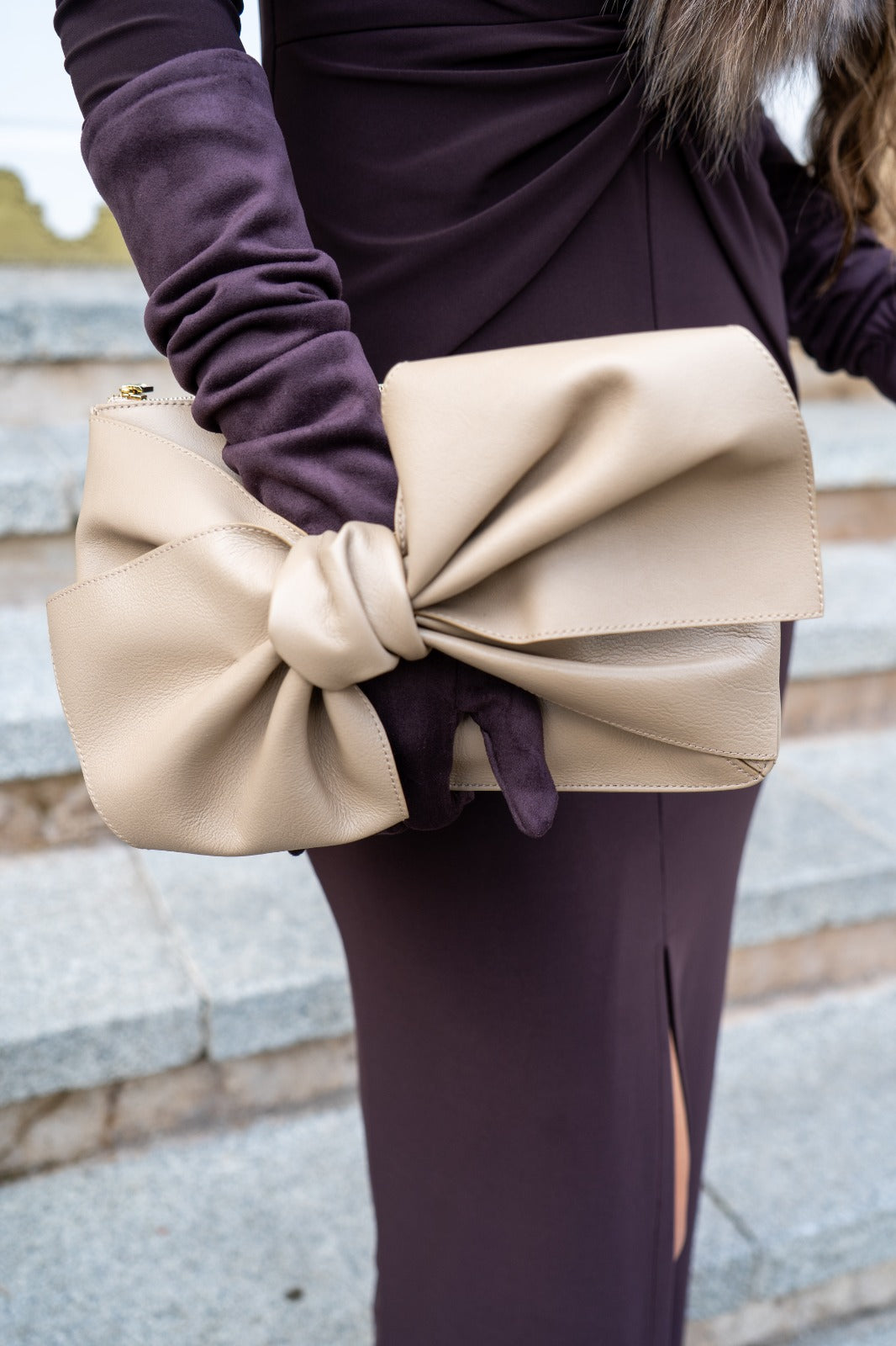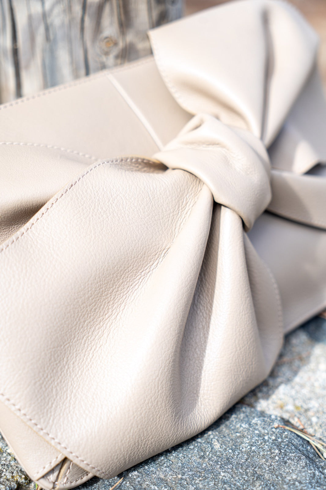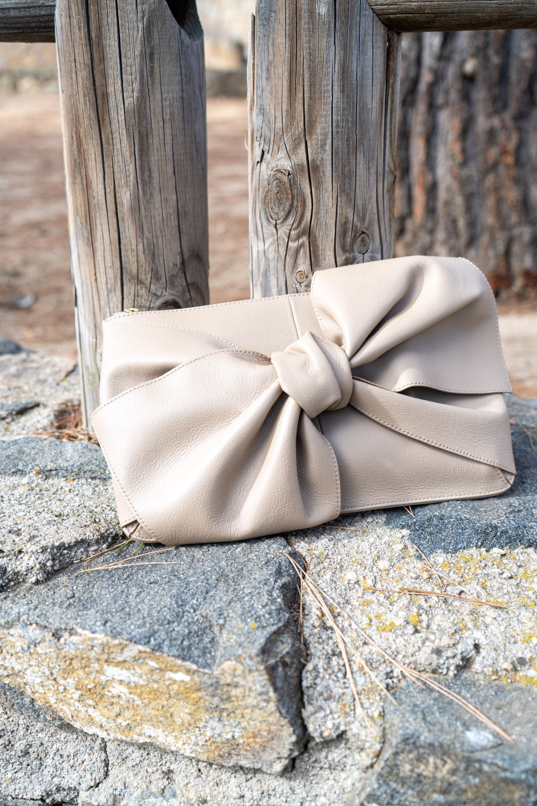 Bolso lazada de piel con forma de cartea o posibilidad de usar con cadera. Cierre con cremallera.