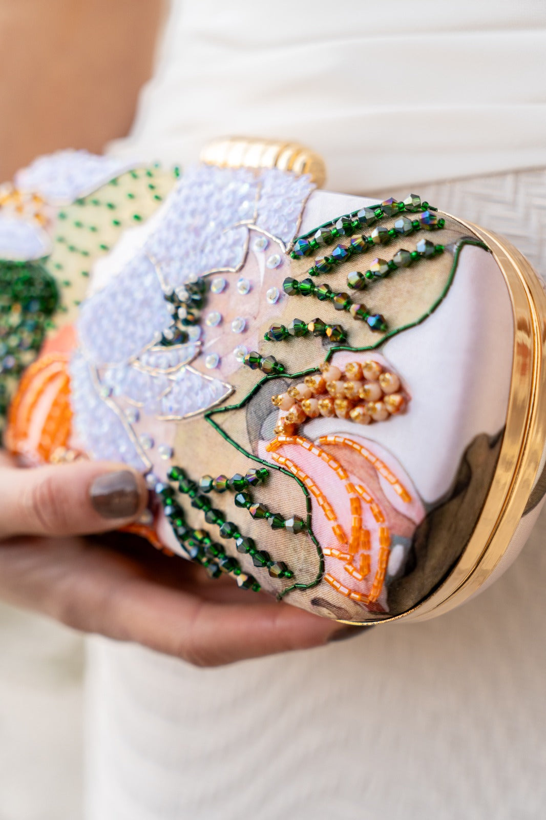 Bolso ovalado, con pomo dorado, cadena larga para colgar. Con estampados y pedrería en varios colores.