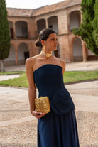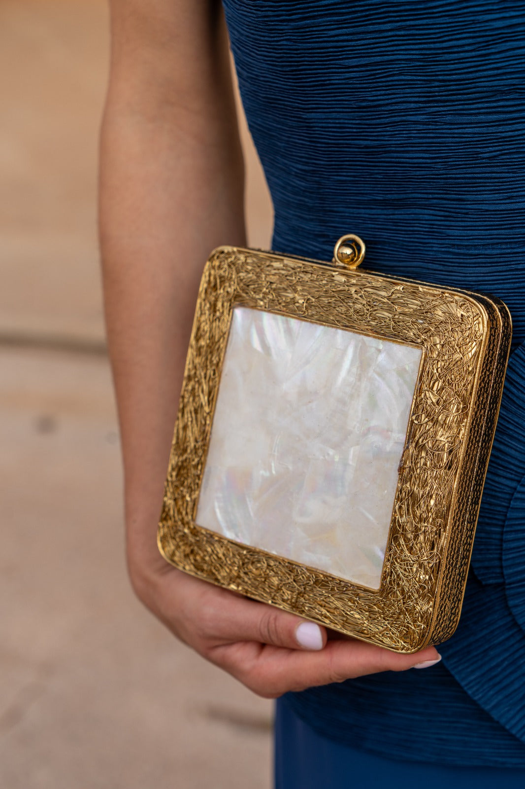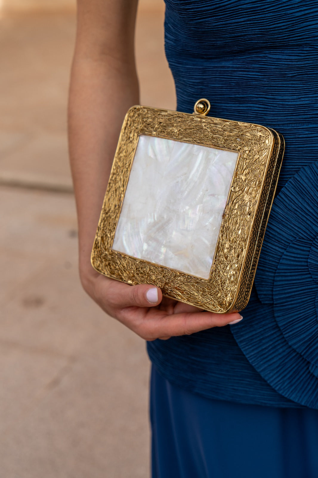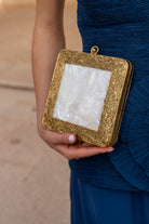 Bolso cuadrado, con labrado dorado por un lado y combinado con nacar por otro, con cadena para colgar. En color dorado.