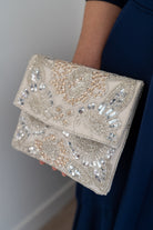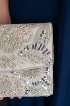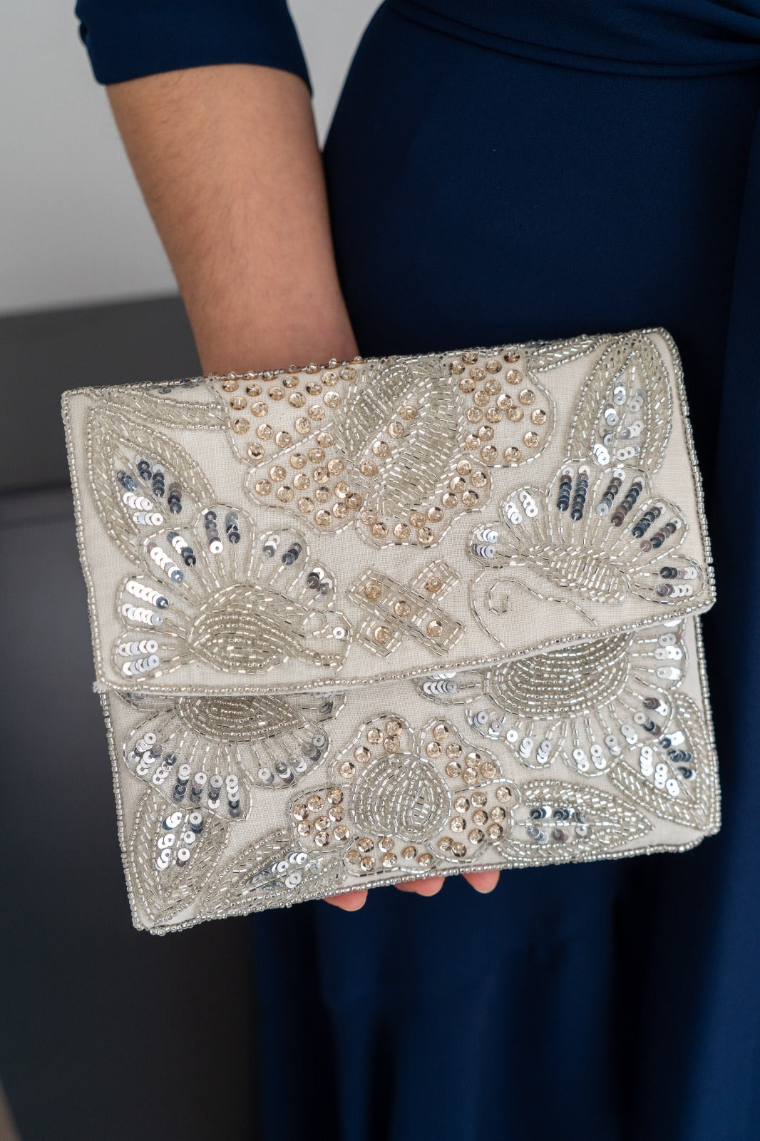 Bolso sobre joya hecho de manera artesanal, cuenta con cadena para llevarlo. En color blanco y plata.