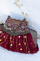 Bolso en tejido burdeos, detalle lentejuelas doradas, cadena corta en dorado.
