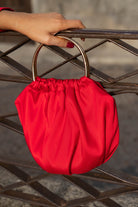 Bombonera hecha a mano con tela de mikado de seda de doble cara en color rojo. Asas doradas.