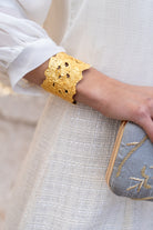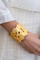 Brazalete dorado con relieve y varios huecos en su superficie, rígido en color dorado.