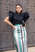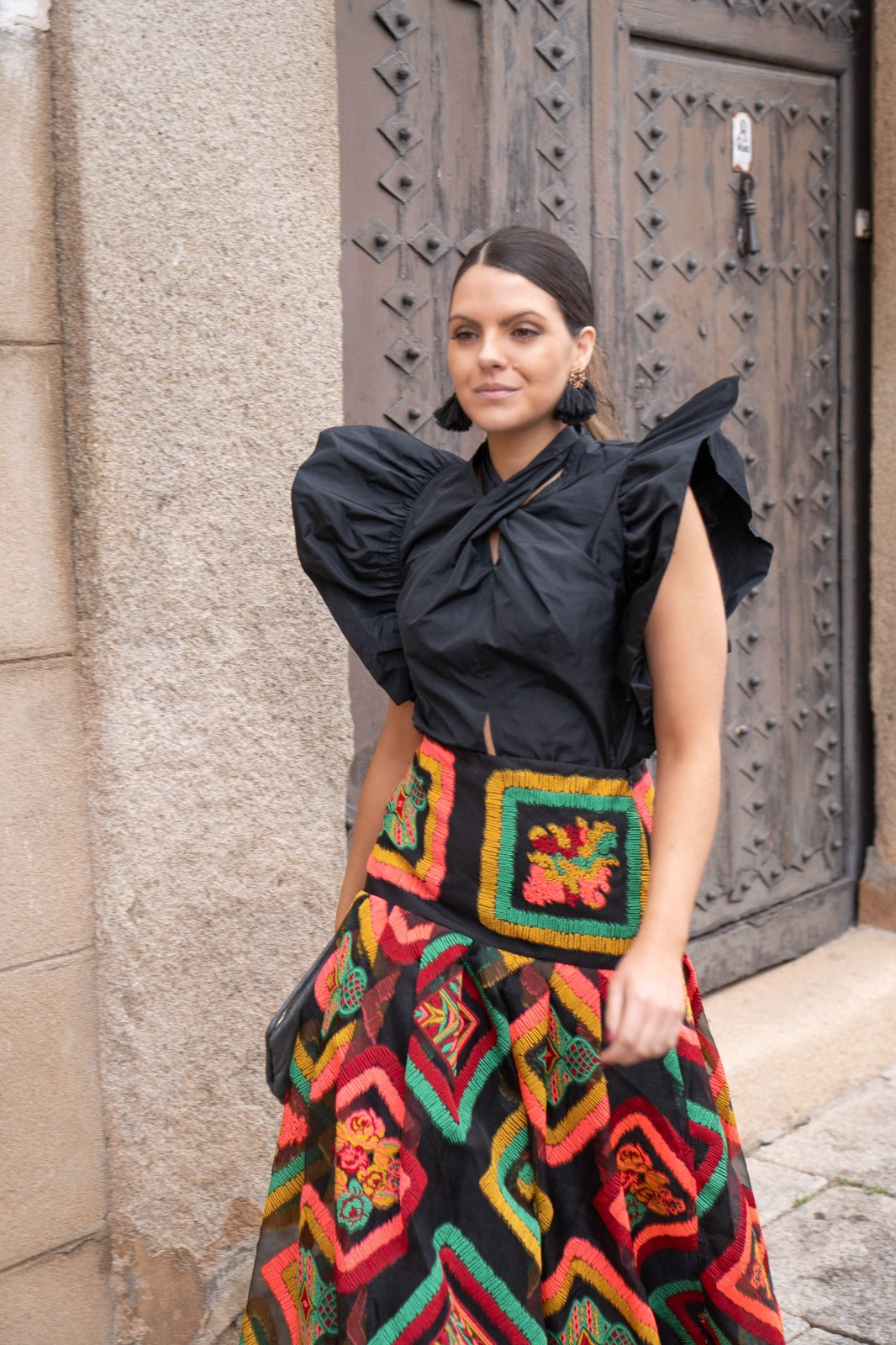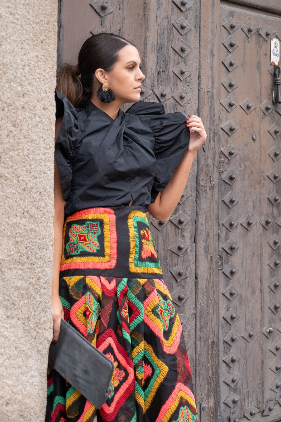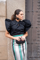 Camisa en tafetan, escote drapeado y cruzado, alerones a modo volantes pronunciados en hombros, pequeña abertura frontal. En color negro.
