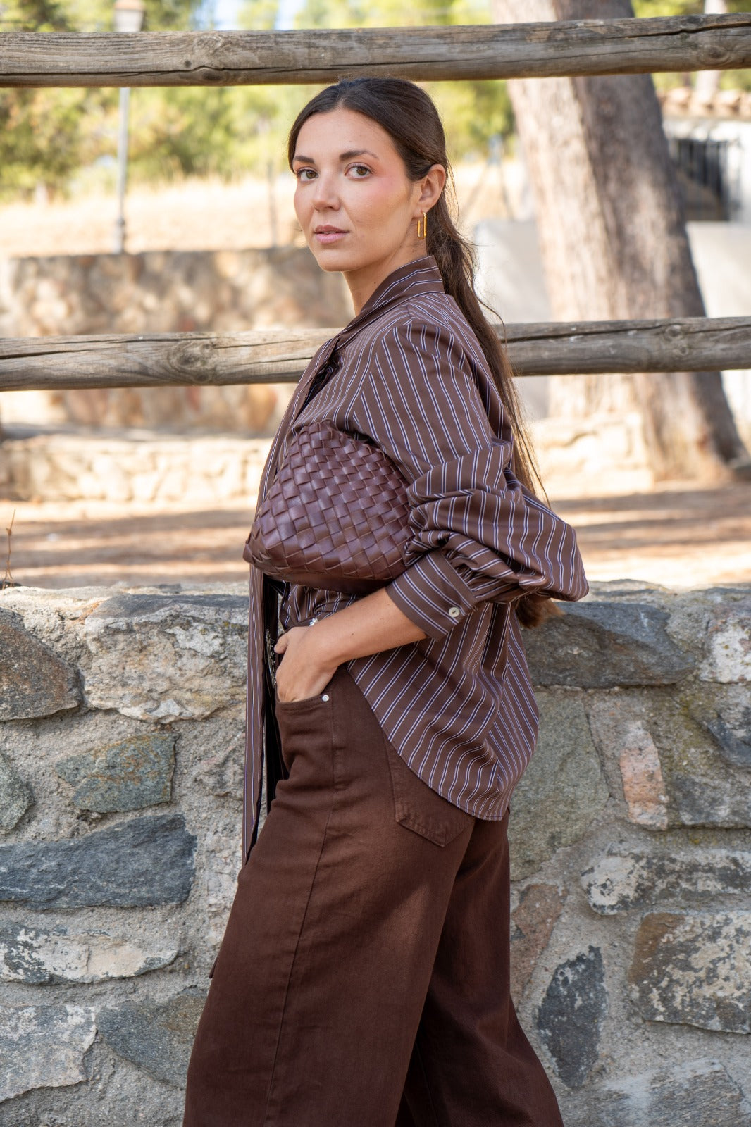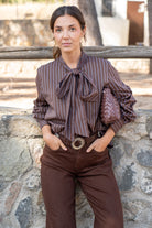 Camisa con lazo en el cuello, mangas abullonadas con puño. En color marrón con rayas.
