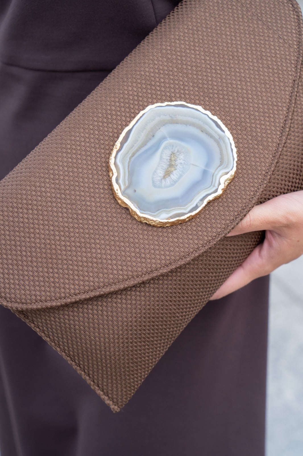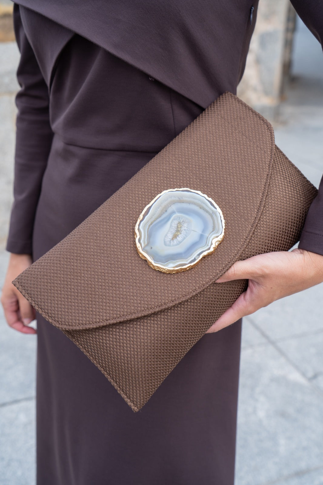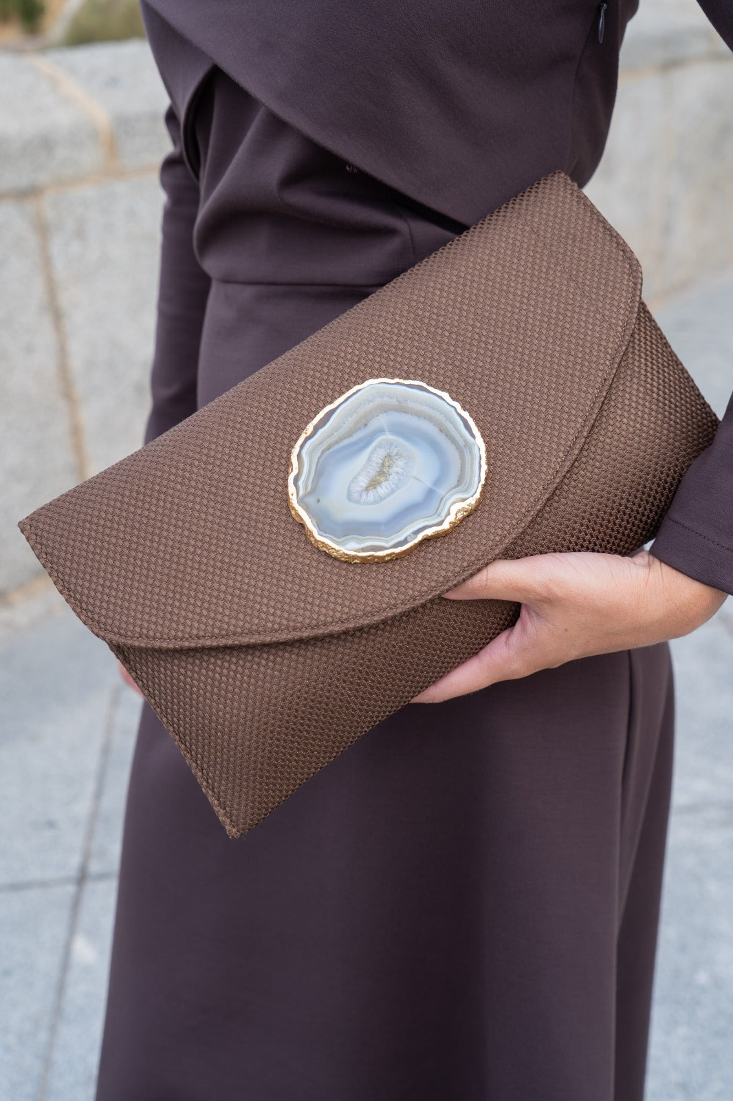 Cartera alargada tipo sobre, en tejido suave, detalle piedra en el centro, cierre con iman, cadena dorada para colgar. En color marron.